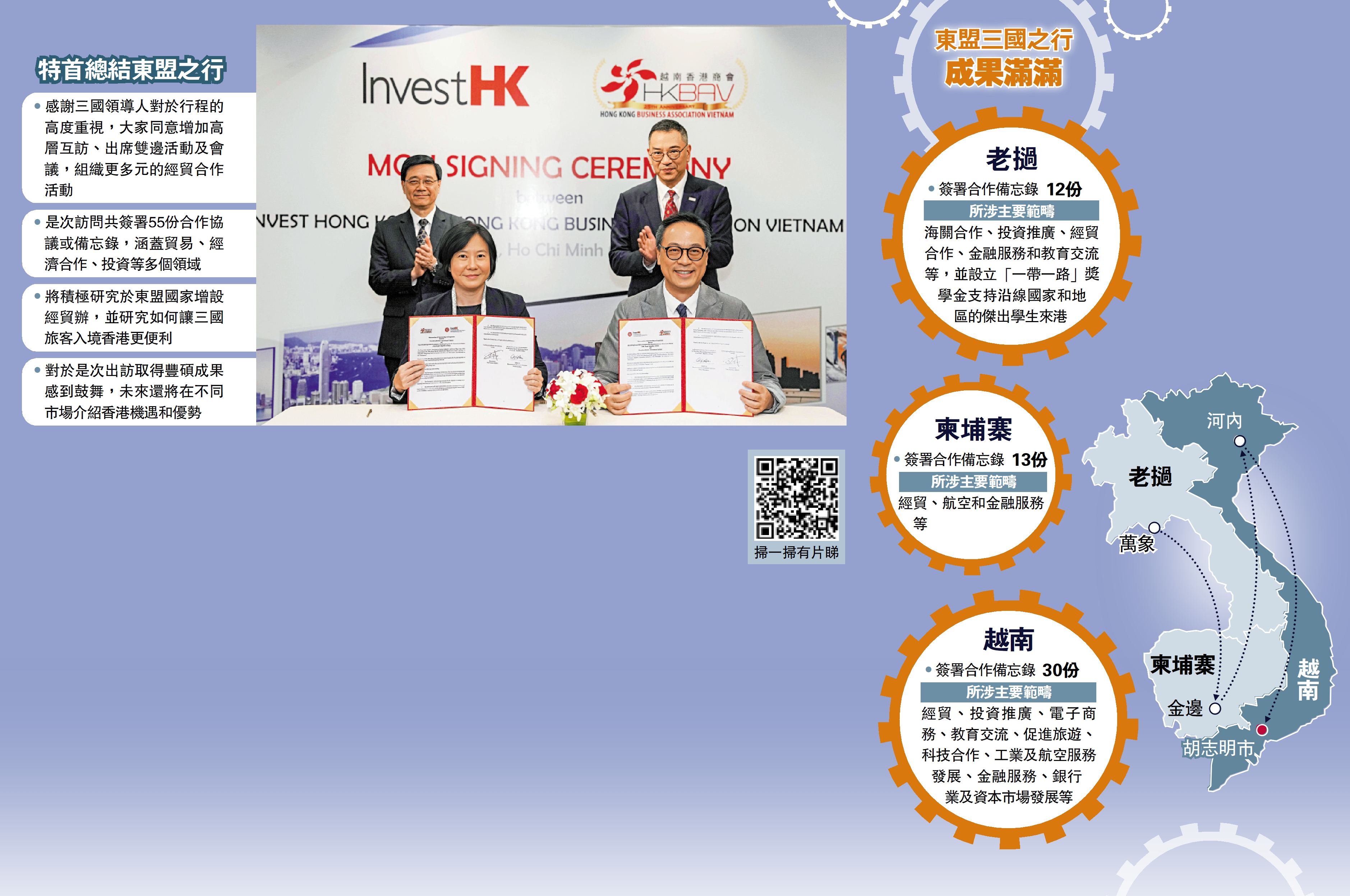 (大公報記者 蔣去悄、李永青〈文〉 何嘉駿〈圖〉 香港越南連線報道)行政長官李家超率領代表團結束為期6天的東盟三國(老撾、柬埔寨、越南)行程。李家超總結指出,此行共取得五項成果,對於取得好成績深受鼓舞,包括三個國家支持香港加入RCEP、加強政府間的關係和往來、鞏固和擴闊了商業網絡、合計簽署55項合作備忘錄、共建「一帶一路」。他形容:「結交了新朋友、鞏固了舊感情、促進了人民交流。」