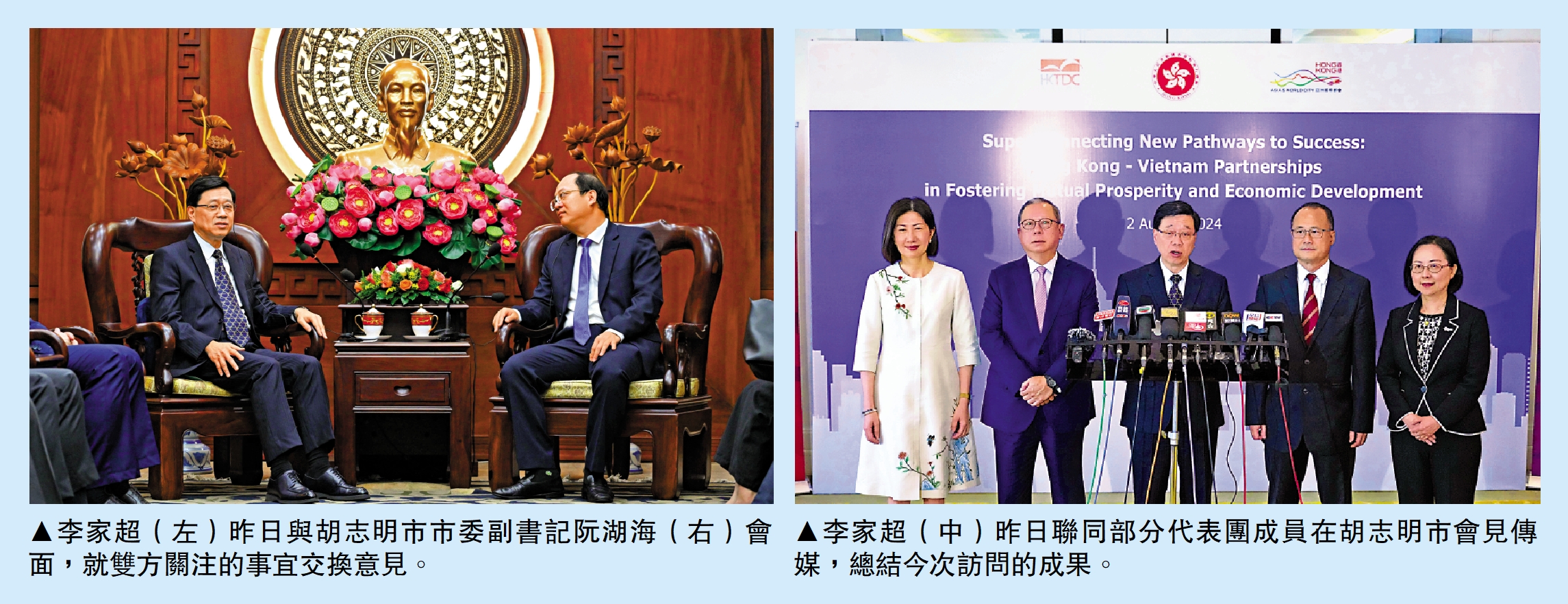 行政長官率團由越南河內轉往胡志明市,進行最後一日訪問行程,中國駐胡志明市總領事魏華祥及越南胡志明市外事廳副廳長陳春水前往機場迎接。昨日早上,李家超與胡志明市委副書記阮湖海會面,就雙方關注的事宜交換意見。李家超表示,胡志明市經濟發展迅速,正致力發展成為國際金融中心。香港作為領先的國際金融中心,可與胡志明市分享經驗和探索合作空間。