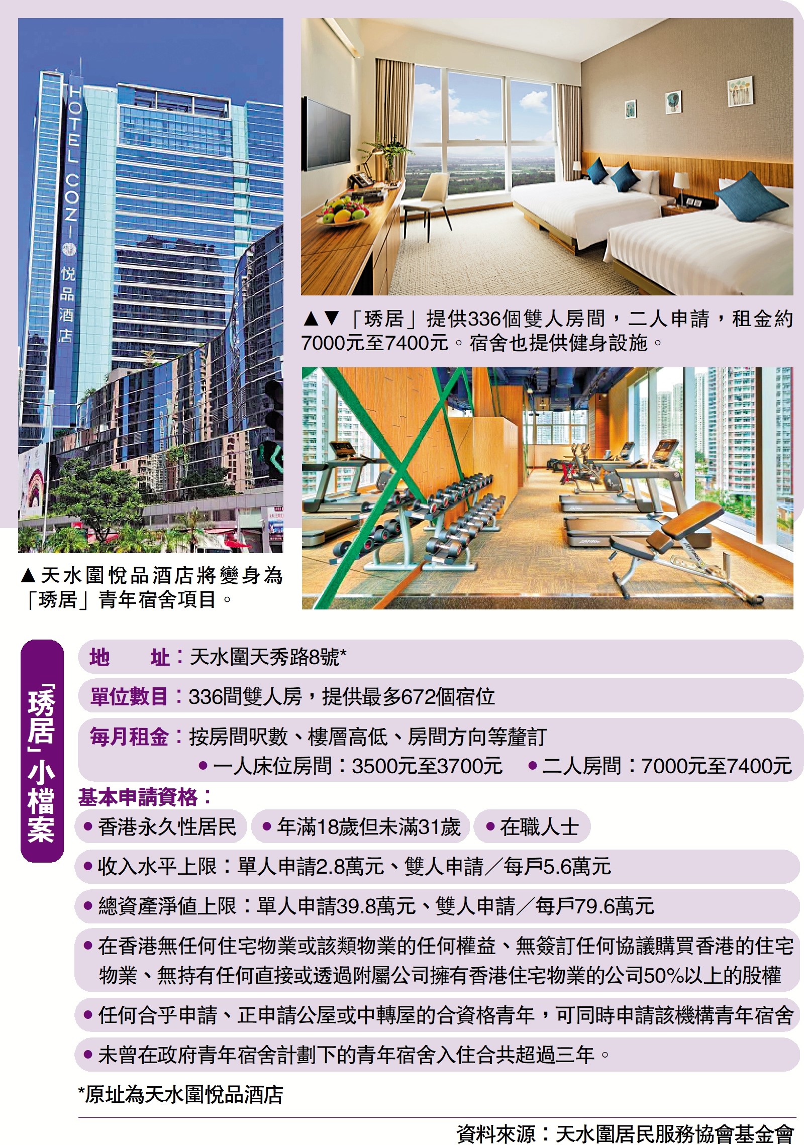 (大公報記者 王亞毛)為支援青年的住屋需要,民政及青年事務局昨日批出第四個青年宿舍項目,將位於天水圍的天水圍悅品酒店轉為「琇居」青年宿舍項目,可供最多672人入住,一人宿位月租低至3500元。負責營運的天水圍居民服務協會基金會預計,該項目最快10月入伙,希望吸引居於天水圍、在北部都會區工作和生活的年輕人入住。宿舍將透過不同類型的培訓和文化交流活動,協助青年租戶擴闊視野,加強他們對國家及世界的認識。