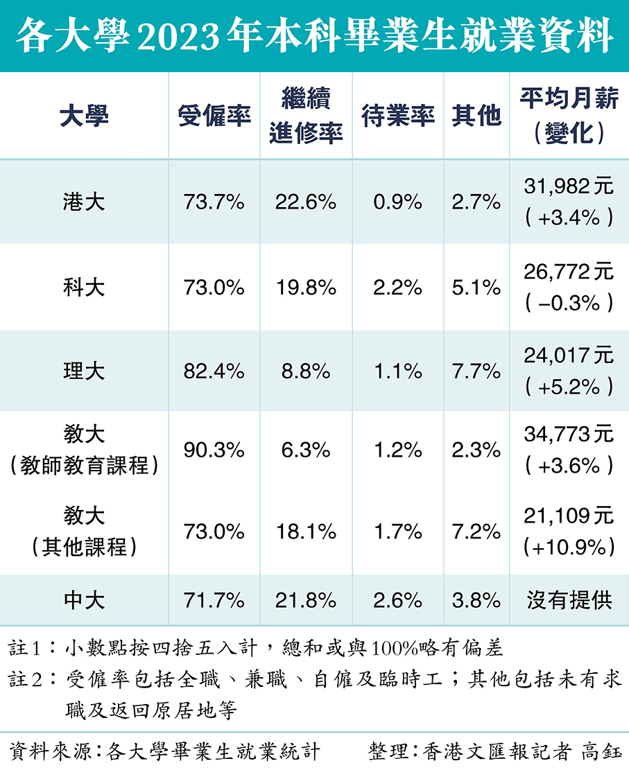 香港中文大學、香港科技大學、香港理工大學和香港教育大學近日也發布了去年畢業生的就業數據(見表)。其中,中大畢業生受僱率為71.7%,但未有提供薪酬資料;科大受僱率為73%,平均月薪為26,772元,較之前一屆微跌0.3%;理大及教大受僱率則相對較高而較少人進修,前者有82.4%畢業生受僱,後者的教師教育課程更逾九成,兩校畢業生薪酬亦較之前一屆有增長。