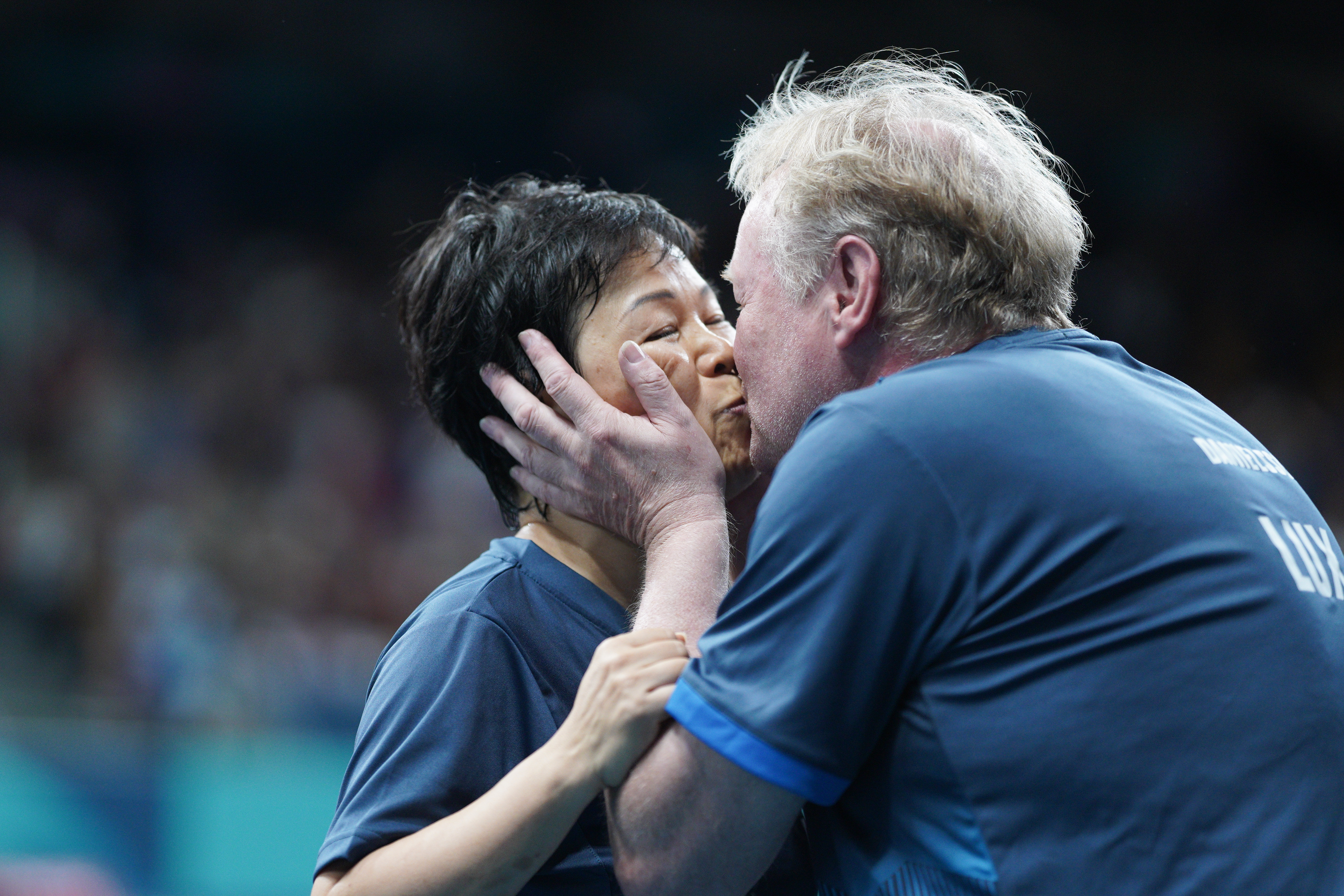 第二次是為了一個吻。比賽結束後,倪夏蓮跑過去一把摟住孫穎莎,咧着嘴在她耳邊說「你真棒!」然後沖回備賽區,跑到她的教練,同時也是她的愛人面前,揮了幾拍復盤動作。對方捧着她的臉,輕輕一吻。