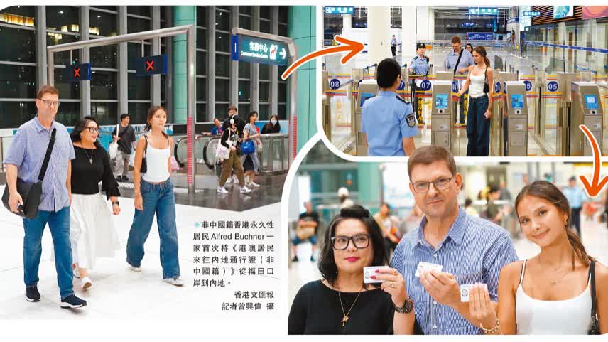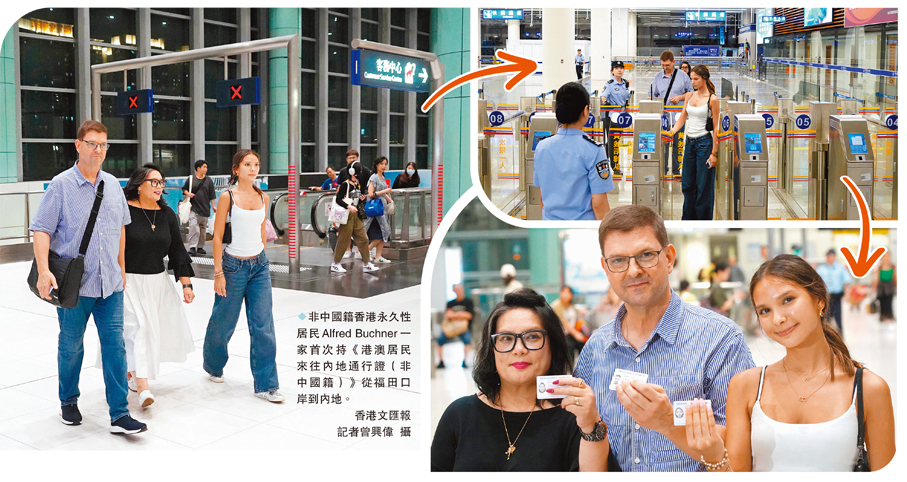 (香港文匯報記者 吳健怡、劉明、王僖)非中國籍的港澳永久性居民上月10日起可申請辦理《港澳居民來往內地通行證(非中國籍)》,在港居住了22年的奧地利商會前委員會成員Alfred Buchner及其妻女,成為首批成功領取通行證人士。他們一家三口昨日持證北上到深圳一日遊,昨晚盡興而歸。Alfred Buchner表示,激活通行證只需要5分鐘,自助過關更僅用5到10秒,整個過程極為方便暢順。他會把這項服務推薦給身邊朋友,並相信通行證能吸引在港的外籍商人與內地企業建立更多連結。而他表示持證便利通關後,未來會計劃到內地更多城市旅遊。