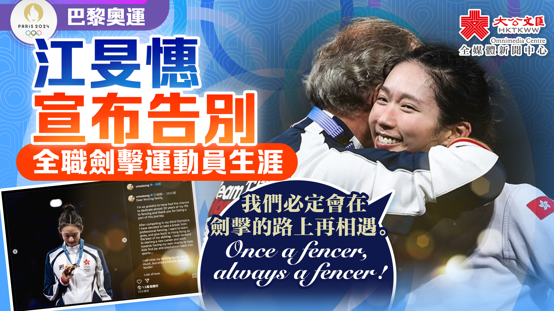 江旻憓再次感謝劍擊團隊給予無限支持,指大家必定會在劍擊路上再相遇,形容「once a fencer, always a fencer」。