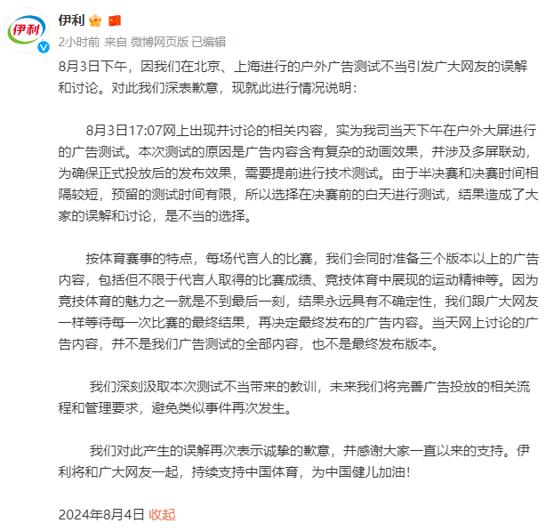 伊利表示,8月3日17:07網上出現並討論的相關內容,實為我司當天下午在戶外大屏進行的廣告測試。本次測試的原因是廣告內容含有複雜的動畫效果,並涉及多屏聯動,為確保正式投放後的發布效果,需要提前進行技術測試。由於半決賽和決賽時間相隔較短,預留的測試時間有限,所以選擇在決賽前的白天進行測試,結果造成了大家的誤解和討論,是不當的選擇。