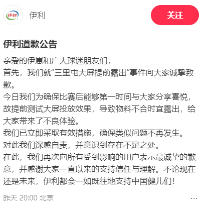 8月3日,有網友發布圖片稱,在巴黎奧運會比賽結果未出前,伊利就在大屏幕投放了「祝賀鄭欽文摘銀」以及「恭喜樊振東男單奪冠」「大滿貫樊振東」「孫穎莎奪得女單金牌」的物料內容。伊利3日起一連兩日在社交平台上發布道歉公告,稱就「大屏提前露出」事件向大家誠摯致歉,提前測試大屏投放效果導致物料不合時宜露出。