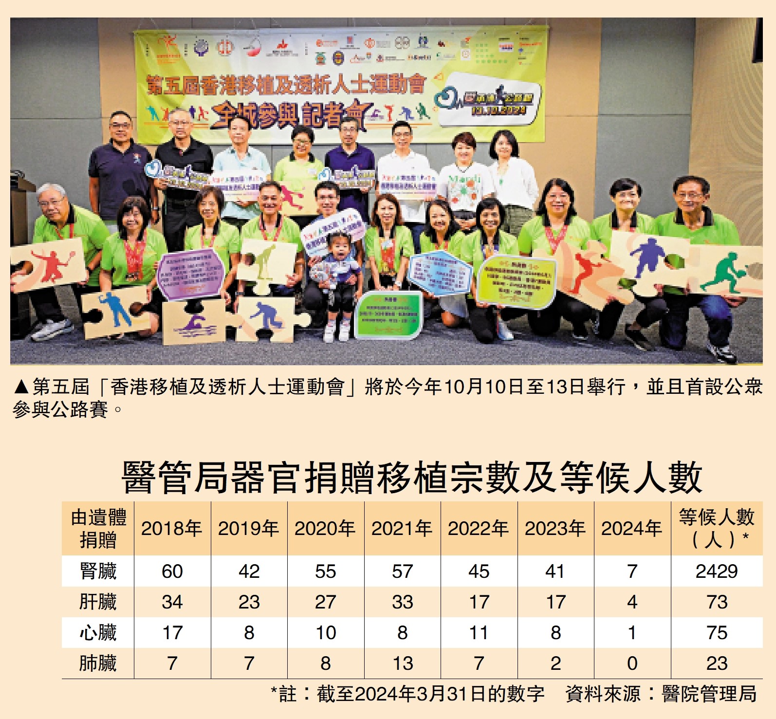 (大公報記者 鍾佩欣)奧運掀起全民運動熱潮,香港移植及透析人士運動會將於10月舉行。主辦單位香港移植運動協會表示,近年器官捐贈數字下跌,今屆運動會的參與人數亦較疫情前減少逾三成,希望透過運動會提升公眾對器官捐贈的認知與支持;協會期望兩地跨境器官移植互助機制盡快落實。