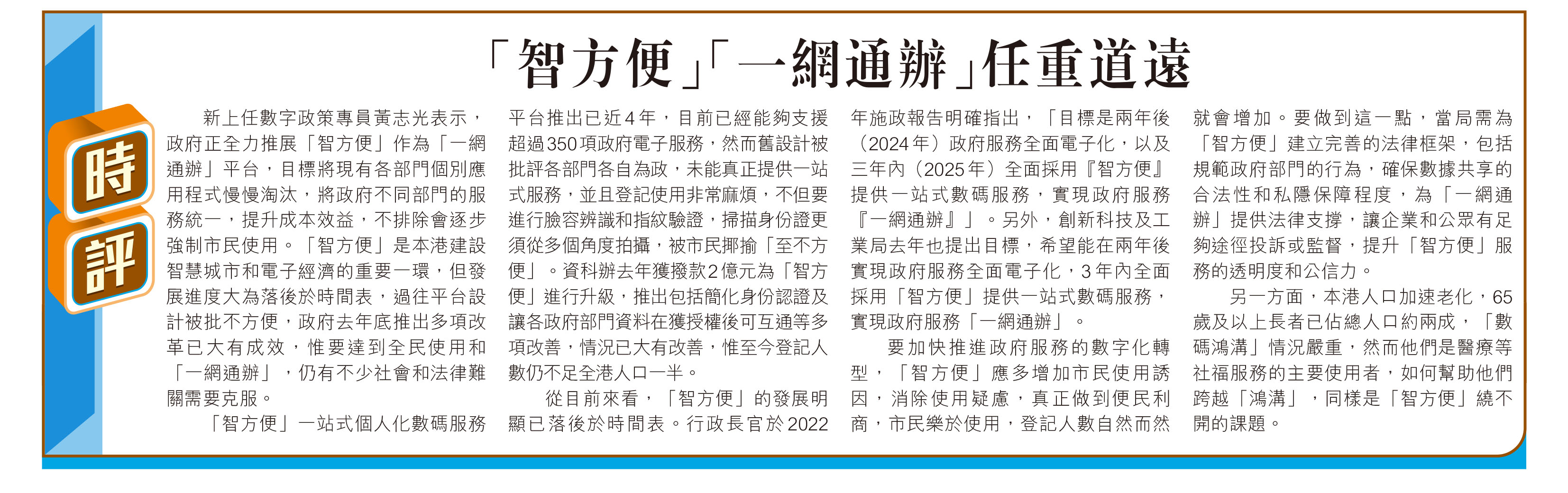 新上任數字政策專員黃志光表示,政府正全力推展「智方便」作為「一網通辦」平台,目標將現有各部門個別應用程式慢慢淘汰,將政府不同部門的服務統一,提升成本效益,不排除會逐步強制市民使用。「智方便」是本港建設智慧城市和電子經濟的重要一環,但發展進度大為落後於時間表,過往平台設計被批不方便,政府去年底推出多項改革已大有成效,惟要達到全民使用和「一網通辦」,仍有不少社會和法律難關需要克服。
