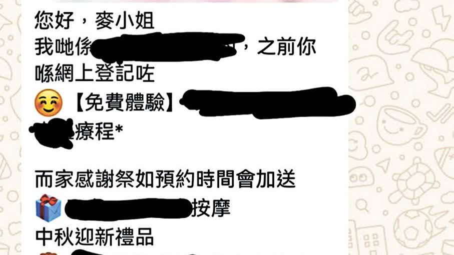 麥美娟在帖文中指,大家都可能收過「順豐包裹錯過送遞」、「您的微信/WhatsApp賬號被凍結」或「您的賬號違規」等等詐騙訊息,而她最近收到一個新類型的WhatsApp詐騙短訊,對方在短訊寫上「您好,麥小姐」作稱呼,然後指麥之前在其網上登記了一個免費療程,現有「感謝祭」,如預約可有額外禮物,包括「按摩」、「月餅」、「鮑魚」等。