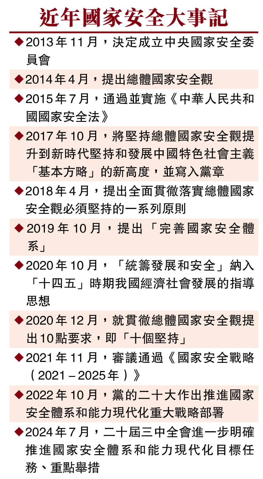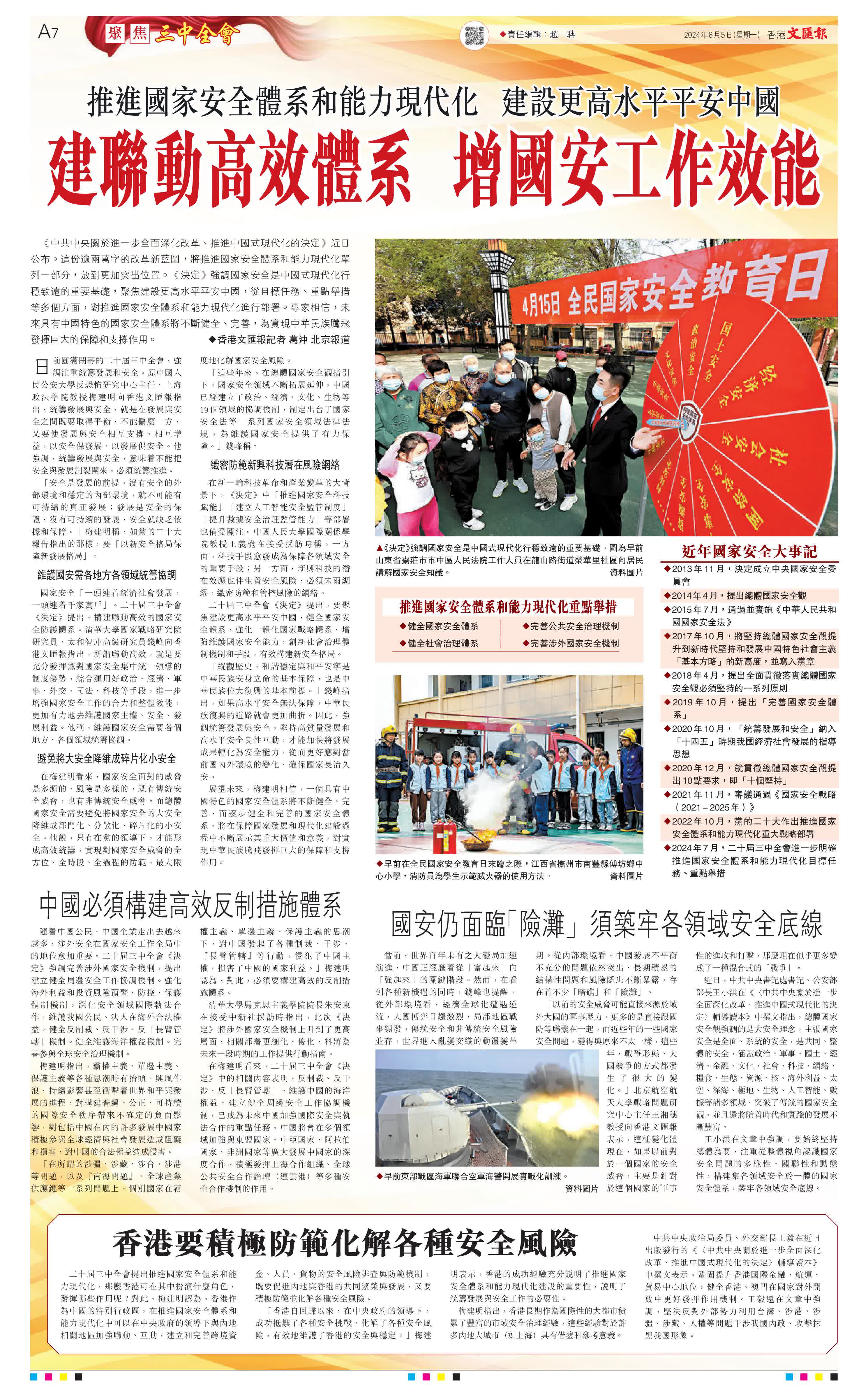 (香港文匯報記者 葛沖 北京報道)《中共中央關於進一步全面深化改革、推進中國式現代化的決定》近日公布。這份逾兩萬字的改革新藍圖,將推進國家安全體系和能力現代化單列一部分,放到更加突出位置。《決定》強調國家安全是中國式現代化行穩致遠的重要基礎,聚焦建設更高水平平安中國,從目標任務、重點舉措等多個方面,對推進國家安全體系和能力現代化進行部署。專家相信,未來具有中國特色的國家安全體系將不斷健全、完善,為實現中華民族騰飛發揮巨大的保障和支撐作用。
