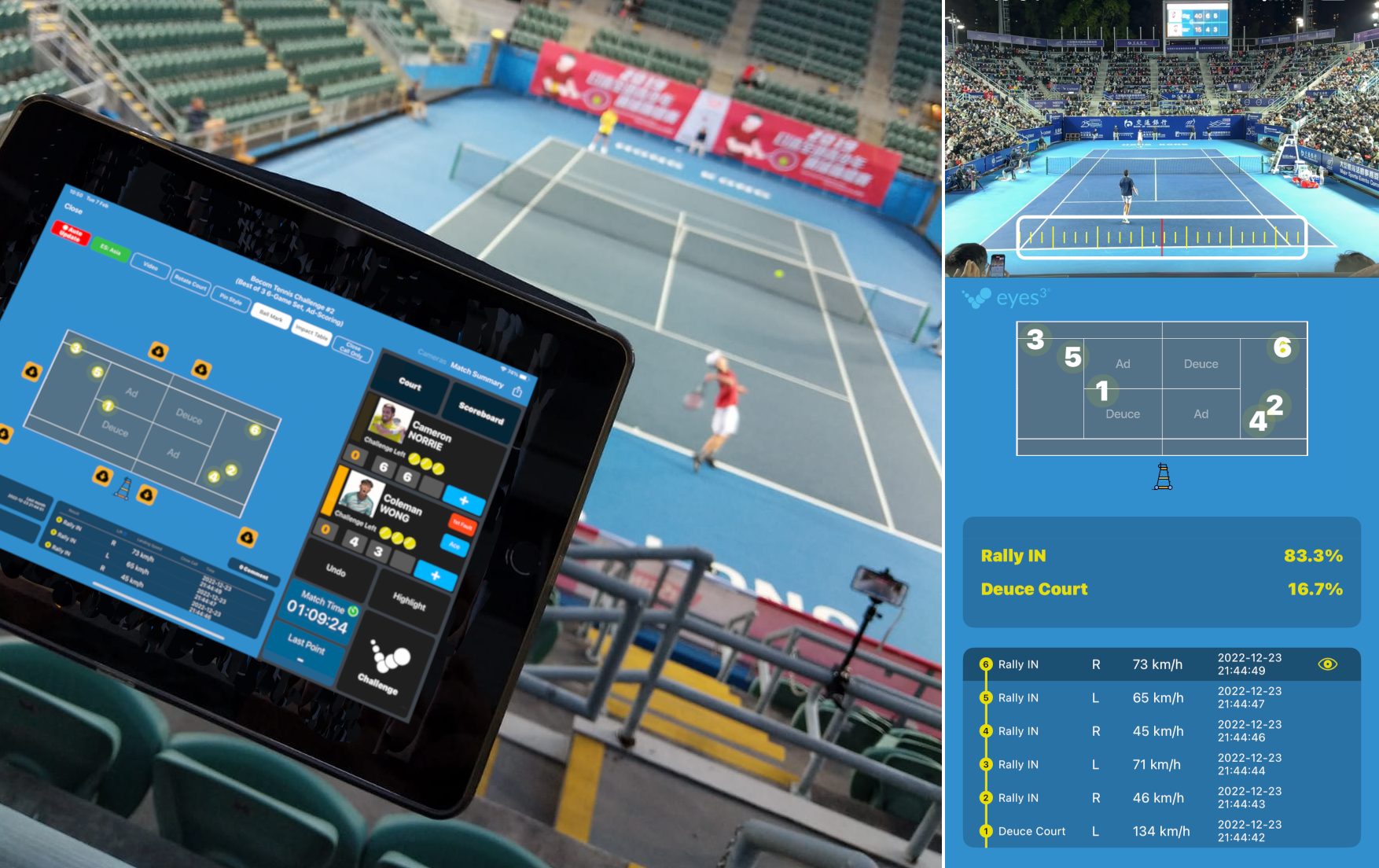 在這股科技浪潮中,數碼港培育初創eyes3憑藉其智能系統成為本地網球運動中的重要科技力量。Eyes3自2019年起與中國香港網球總會(HKCTA)合作,作為其官方比賽裁判系統,系統亦已用於多項網球賽事中,包括「Asia Pacific Padel Tour (APPT) HONG KONG GRAND SLAM 2024」「香港國際網球挑戰賽2022」等大型賽事。