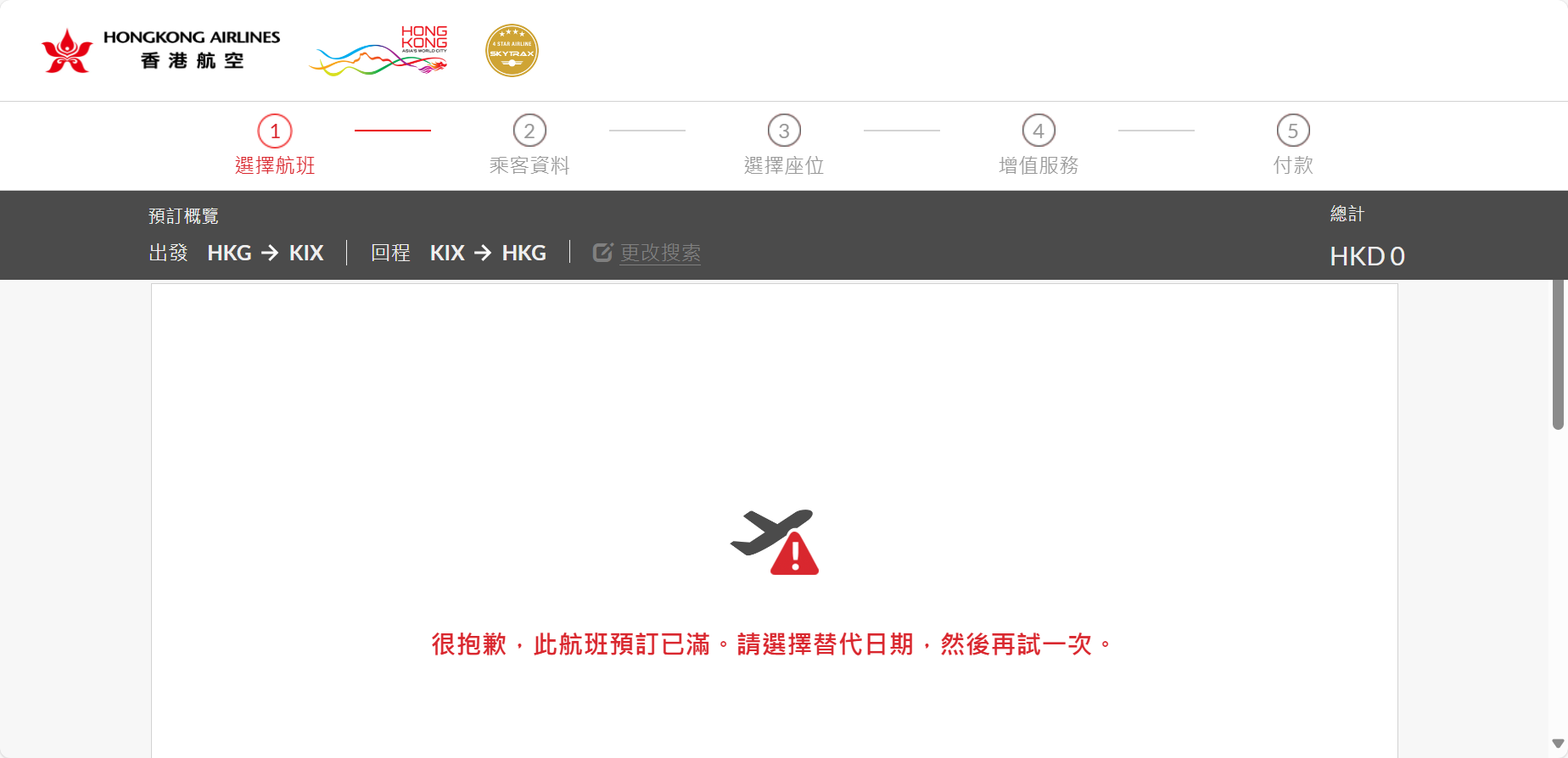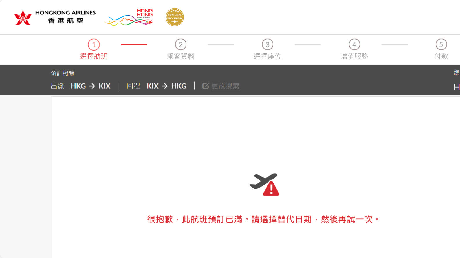 記者返回點選航班目的地的頁面,各航班機票限額均無改變,仍可以點選進入輪候排隊,不過時間仍是多於兩小時。記者轉戰「大阪(KIX)」航點,終於時來運也進入購票頁面,更精挑細選旅行日期,不過就被提示「此航班預定已滿」,於是又要從重新點選航班開始,再輪候網站「垂憐」,無窮盡也。