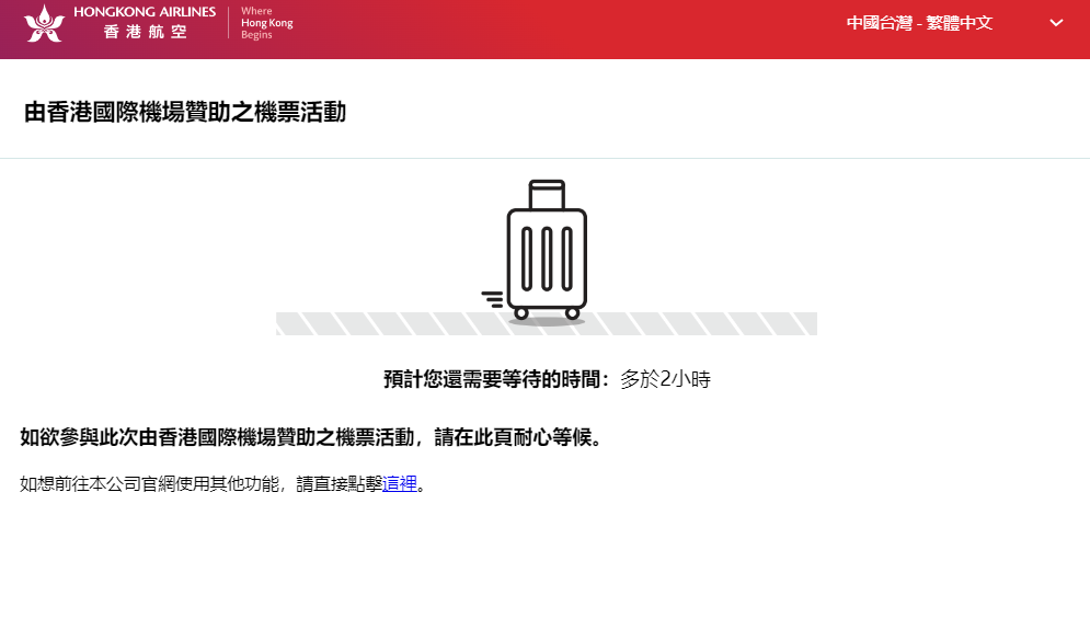 大公文匯全媒體記者今早10時準點登入網站,並選擇熱門目的地「東京(NRT)」,當時跳轉頁面即顯示「預計您還需要等待的時間:多於2小時」;惟等候期間網頁無緣無故跳出「錯誤代碼」,須重新點選航班輪候。