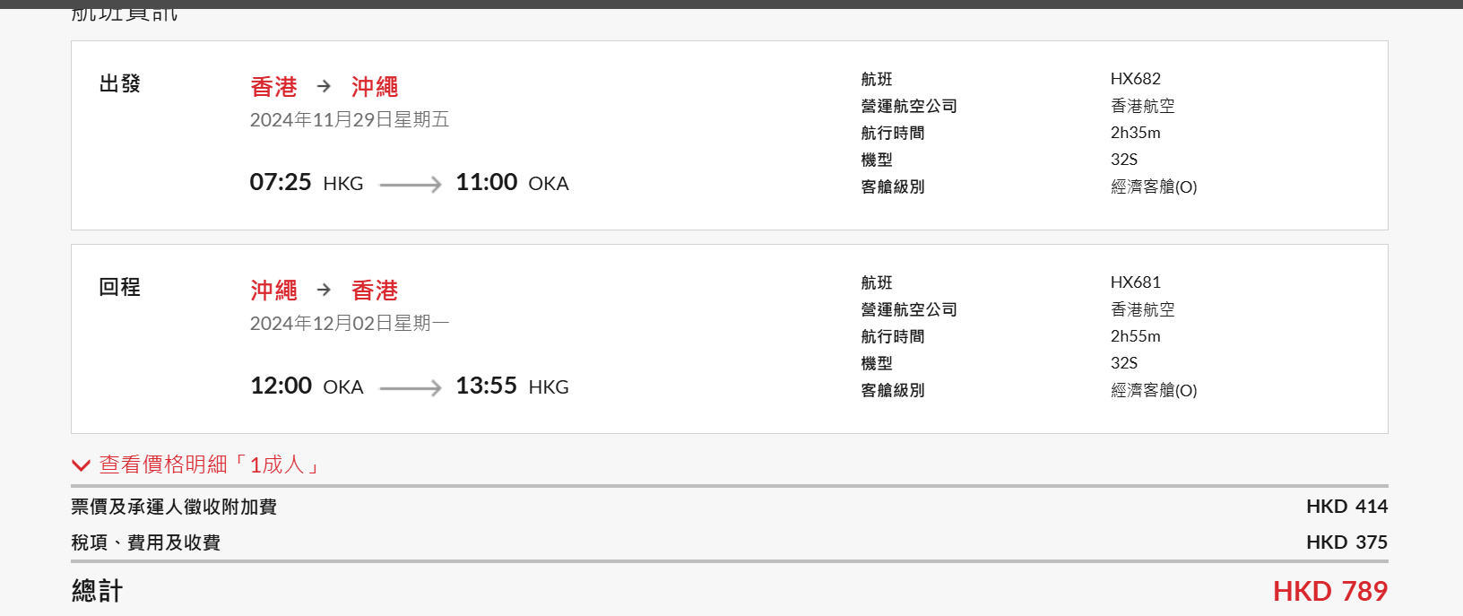 不過功夫不負有心人,經過多番轉移航點改變旅行時間,記者以加入附加費及稅費後789HKD的價格,成功購入香港往返沖繩機票,也都幾抵。
