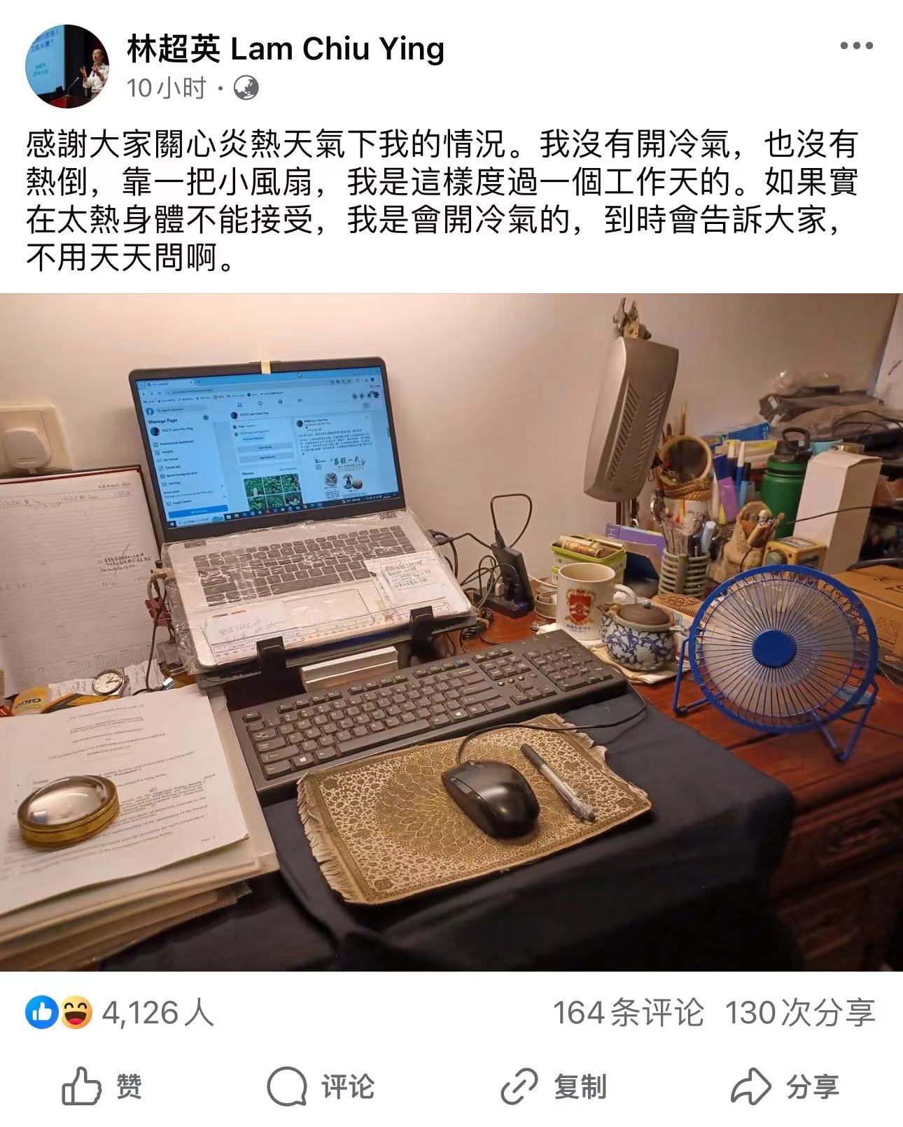 林超英今日在Facebook發帖,首先感謝大家關心酷熱天氣下他的情況。他在帖文中重申自己仍然沒有開冷氣但也沒有熱倒,「靠一把小風扇,我是這樣度過一個工作天的」。林超英表示,如果實在太熱身體不能接受,他是會開冷氣的,「到時會告訴大家,不用天天問啊」。