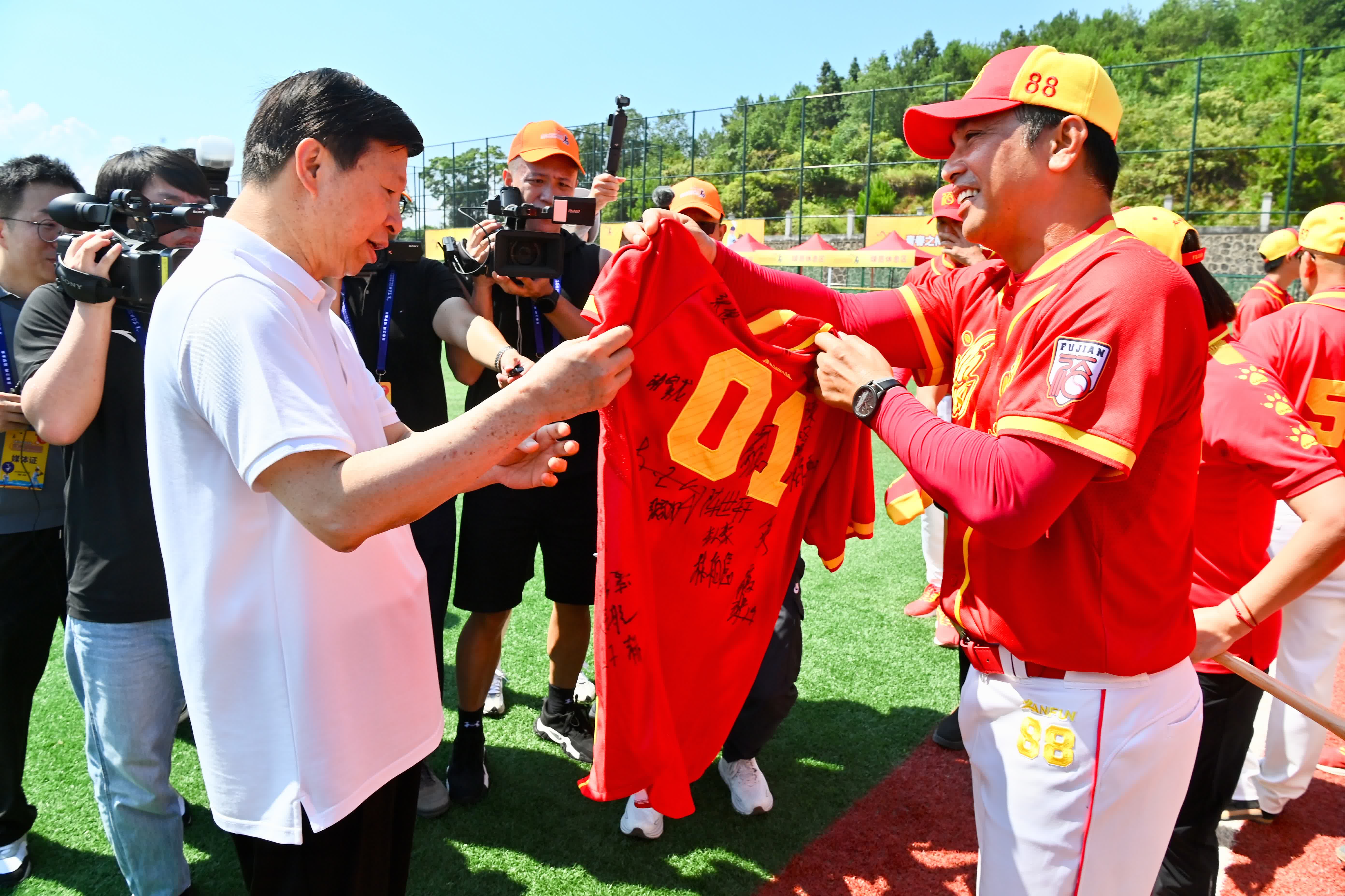 (大公報 記者 蔣煌基 龍岩報道)以「青春之棒·築夢未來」為主題的2024年東森杯海峽兩岸(連城)青少年棒球邀請賽暨第五屆海峽兩岸(連城)青少年棒球文化節,6日在福建省龍岩市連城縣開幕。中共中央台辦、國務院台辦主任宋濤現場發球啟動比賽,並在與台灣台東紅葉小學五年級的棒球隊隊員林荿穠交流時親切地說:「大陸也是你們的家,歡迎你們常來,我們都是一家人。」此外,閩台聯合福建棒球隊向宋濤贈送簽名球衣。