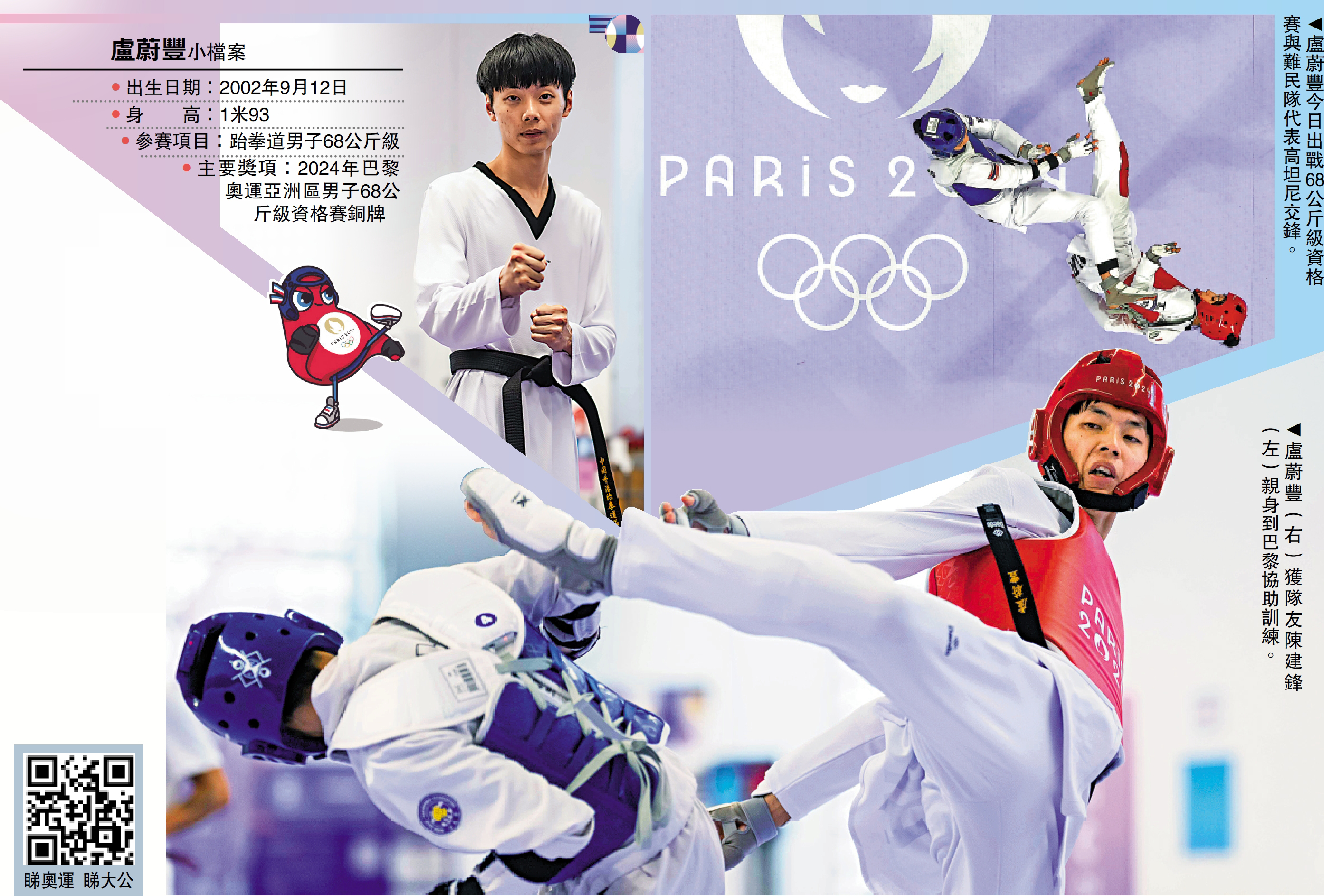 巴黎奧運已進入倒數階段,今屆奧運跆拳道項目將會在巴黎大皇宮舉行賽事,這裏正是香港代表隊勇奪兩枚劍擊金牌的比賽場館。盧蔚豐是香港最後兩位出戰奧運的選手(另一人是已在單車公路賽亮相、8月11日出戰場地全能賽的李思穎),其世界排名為209位,曾於3月出戰亞洲區奧運資格賽奪得銅牌,卻因未能殺入決賽獲得奧運資格,不過由於他的4強對手、阿富汗的阿巴斯被取消資格,盧蔚豐在最後關頭得以遞補身份拿下寶貴的奧運入場券,成為香港歷史首名出戰奧運跆拳道的健兒。
