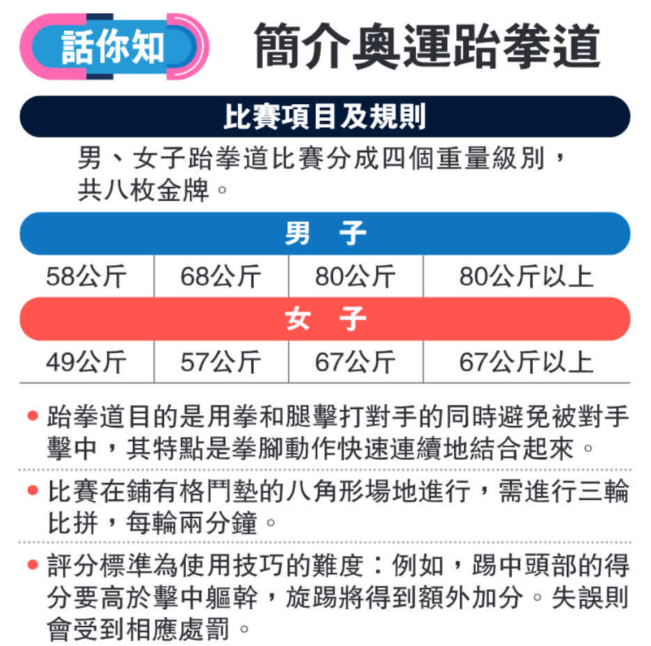 開幕式翌日的女子重劍個人賽,江旻憓以「世一」身份於決賽以「決一劍」逆轉勝奪金;至於張家朗同樣於男子花劍決賽中,經歷3次「決一劍」封王,更成為68年來首個衛冕奧運男子花劍項目的劍手。盧蔚豐今日接力在巴黎大皇宮出戰跆拳道,期望這個港隊福地,有助他力爭佳績。