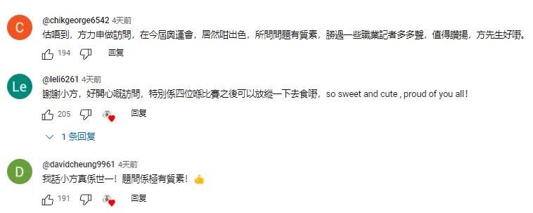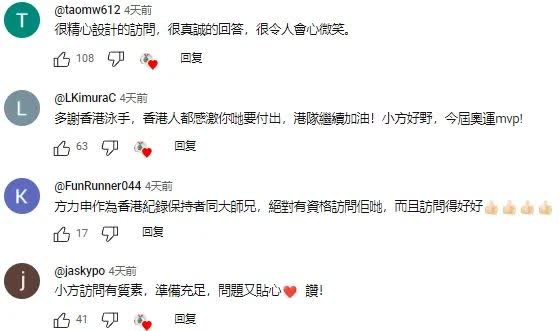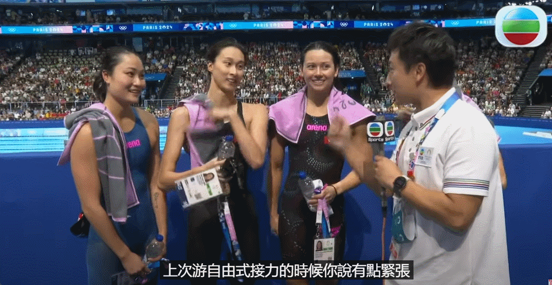 8月3日,港隊游泳隊代表派出何詩蓓、歐鎧淳、簡綽桐及譚凱琳出戰女子4×100混合泳初賽,最終雖然無緣晉級,四位選手接受方力申訪問時卻笑得相當開懷。