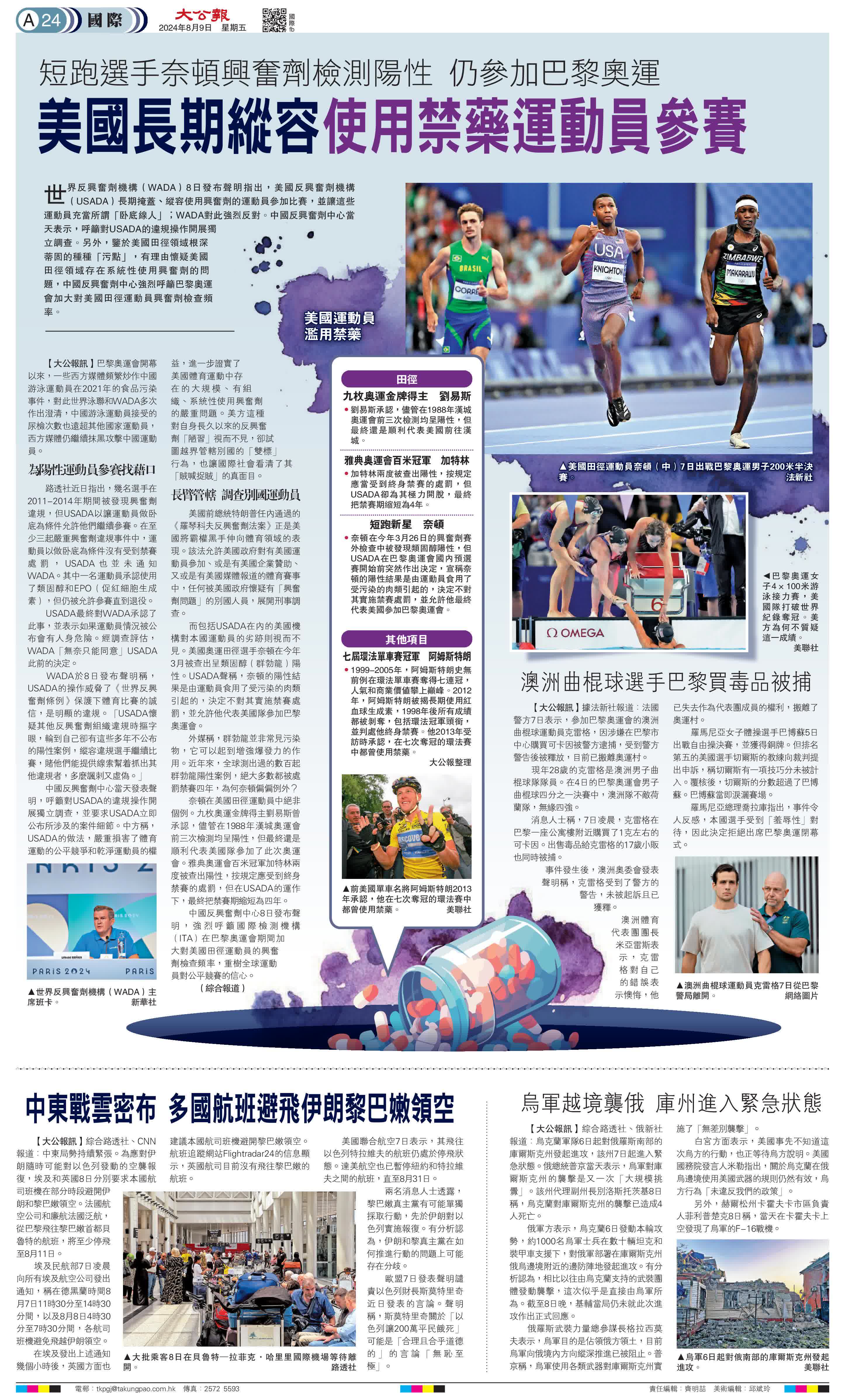 大公報綜合報道,世界反興奮劑機構(WADA)8日發布聲明指出,美國反興奮劑機構(USADA)長期掩蓋、縱容使用興奮劑的運動員參加比賽,並讓這些運動員充當所謂「卧底線人」;WADA對此強烈反對。中國反興奮劑中心當天表示,呼籲對USADA的違規操作開展獨立調查。另外,鑒於美國田徑領域根深蒂固的種種「污點」,有理由懷疑美國田徑領域存在系統性使用興奮劑的問題,中國反興奮劑中心強烈呼籲巴黎奧運會加大對美國田徑運動員興奮劑檢查頻率。