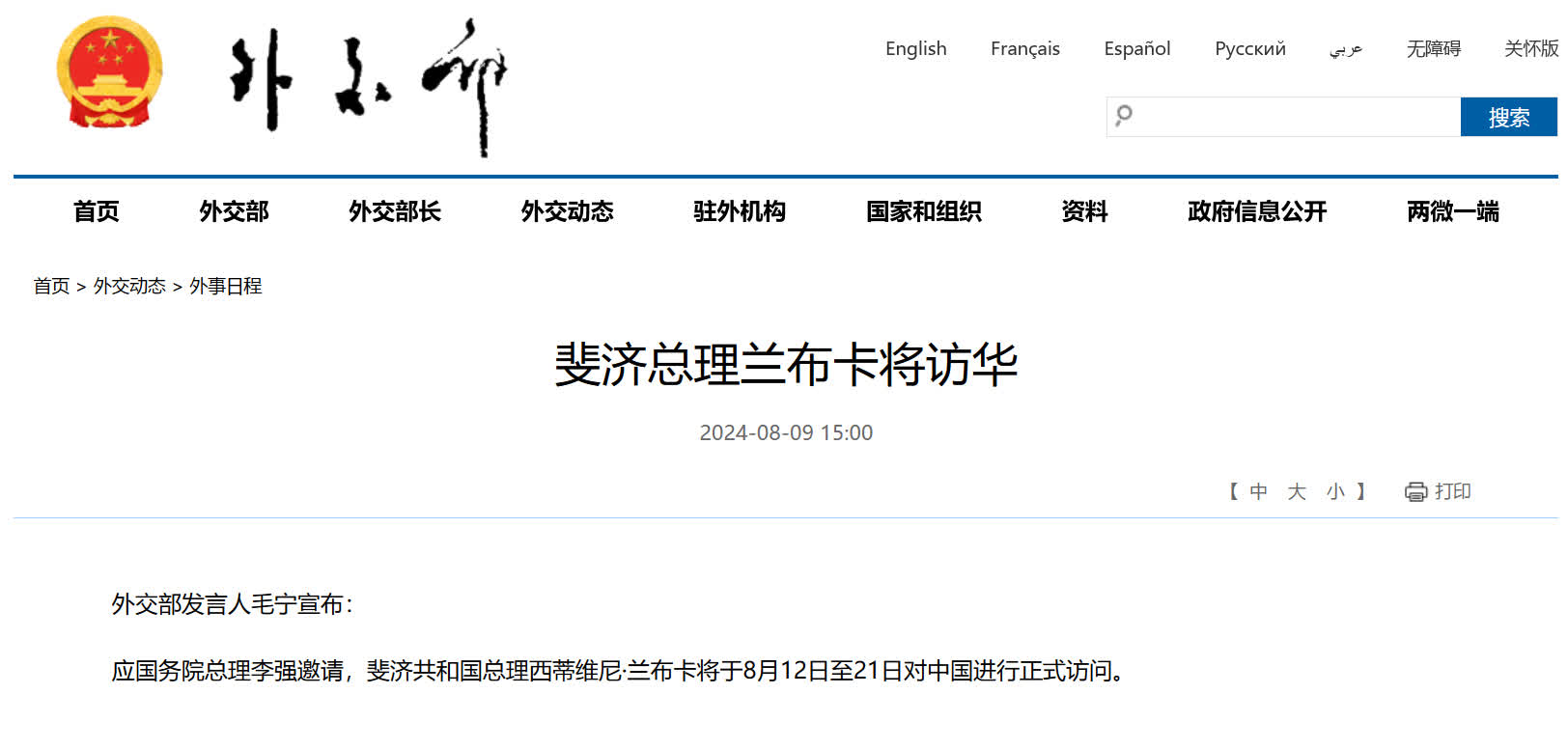 據外交部網站消息,8月9日,外交部發言人毛寧宣布:應國務院總理李強邀請,斐濟共和國總理西蒂維尼·蘭布卡將於8月12日至21日對中國進行正式訪問。