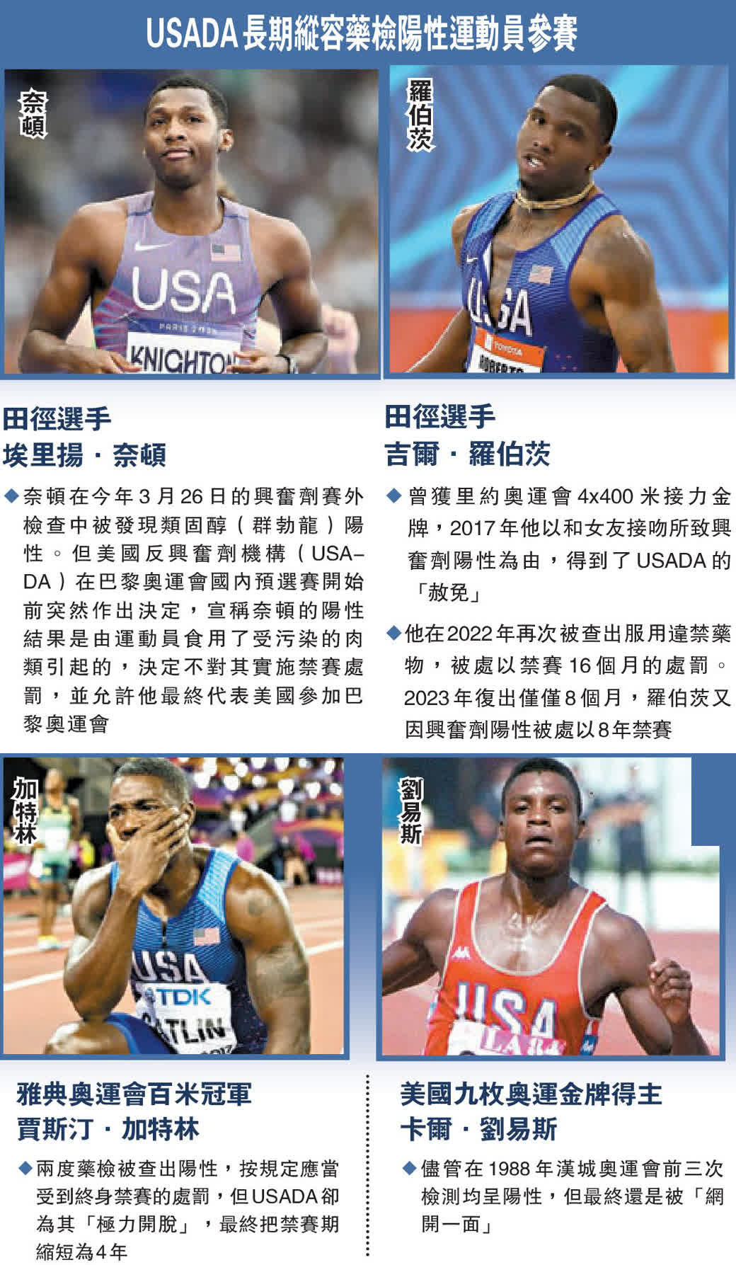奈頓在美國田徑運動員中絕非個例。九枚奧運金牌得主劉易斯曾承認,盡管在1988年漢城奧運會前三次檢測均呈陽性,但最終還是順利代表美國隊參加了此次奧運會。雅典奧運會百米冠軍加特林兩度被查出陽性,按規定應受到終身禁賽的處罰,但在USADA的運作下,最終把禁賽期縮短為四年。