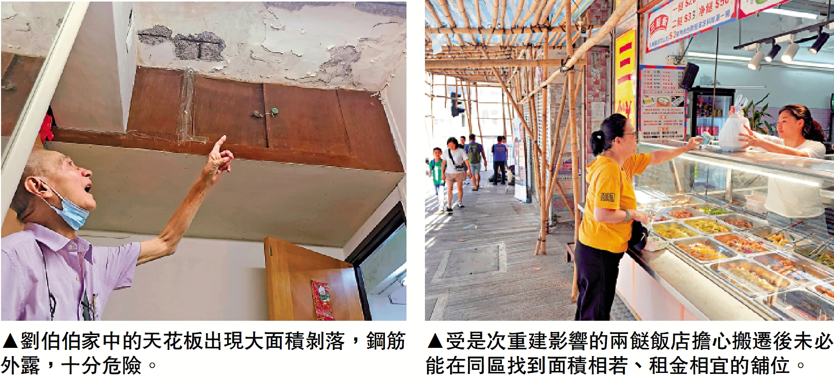 年近81歲的劉伯伯受今次重建影響,他說1987年購買現住的890平方呎單位,不想搬走,但樓宇太殘舊,天花板大面積剝落,形容十分危險。大廈大維修工程於上月底展開,每個業主攤分支付20多萬元,現已支付第一期約11萬多元,搭棚工作已經完成,「市建局應該再早些提出重建方案,這樣就避免再交一筆維修費用!」