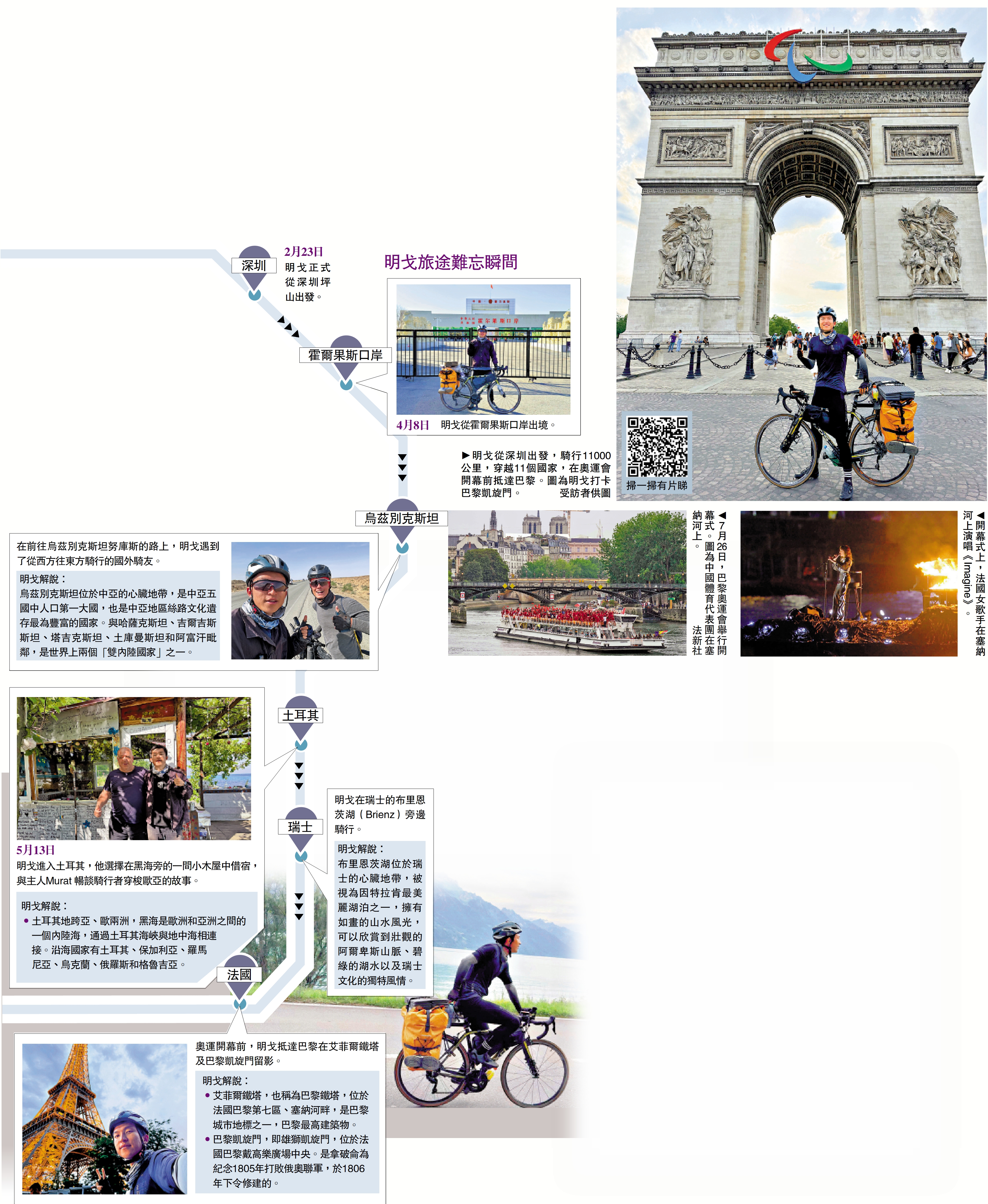 (大公報記者 石華 深圳報道)「我是淋着雨看完開幕式的,法國女歌手在塞納河上演唱《Imagine》,歌曲唱完後,屏幕上寫着,『We stand and call for peace』,我理解為『我們來到這裏是為了呼籲和平』,這句話特別震撼。」7月26日,巴黎奧運會開幕式在雨中舉行,從深圳出發騎行11000公里的25歲小伙子明戈(化名),參與這場舉世矚目的體壇盛事,迎來萬里騎行之旅的高潮。