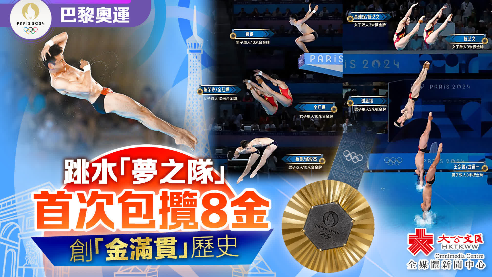 (香港文匯報記者 郭正謙 綜合報道)巴黎奧運會中國跳水隊寫下奧運歷史新一頁!在昨日的男子單人10米跳台跳水項目,曹緣以547.5分的完美表現力壓群雄,勇奪本屆奧運跳水賽場最後一面金牌,助國家隊包攬今屆奧運跳水項目所有金牌,實現了奧運史無前例的「八金傳奇」,為中國跳水「夢之隊」的巴黎奧運之旅畫上完美句號。