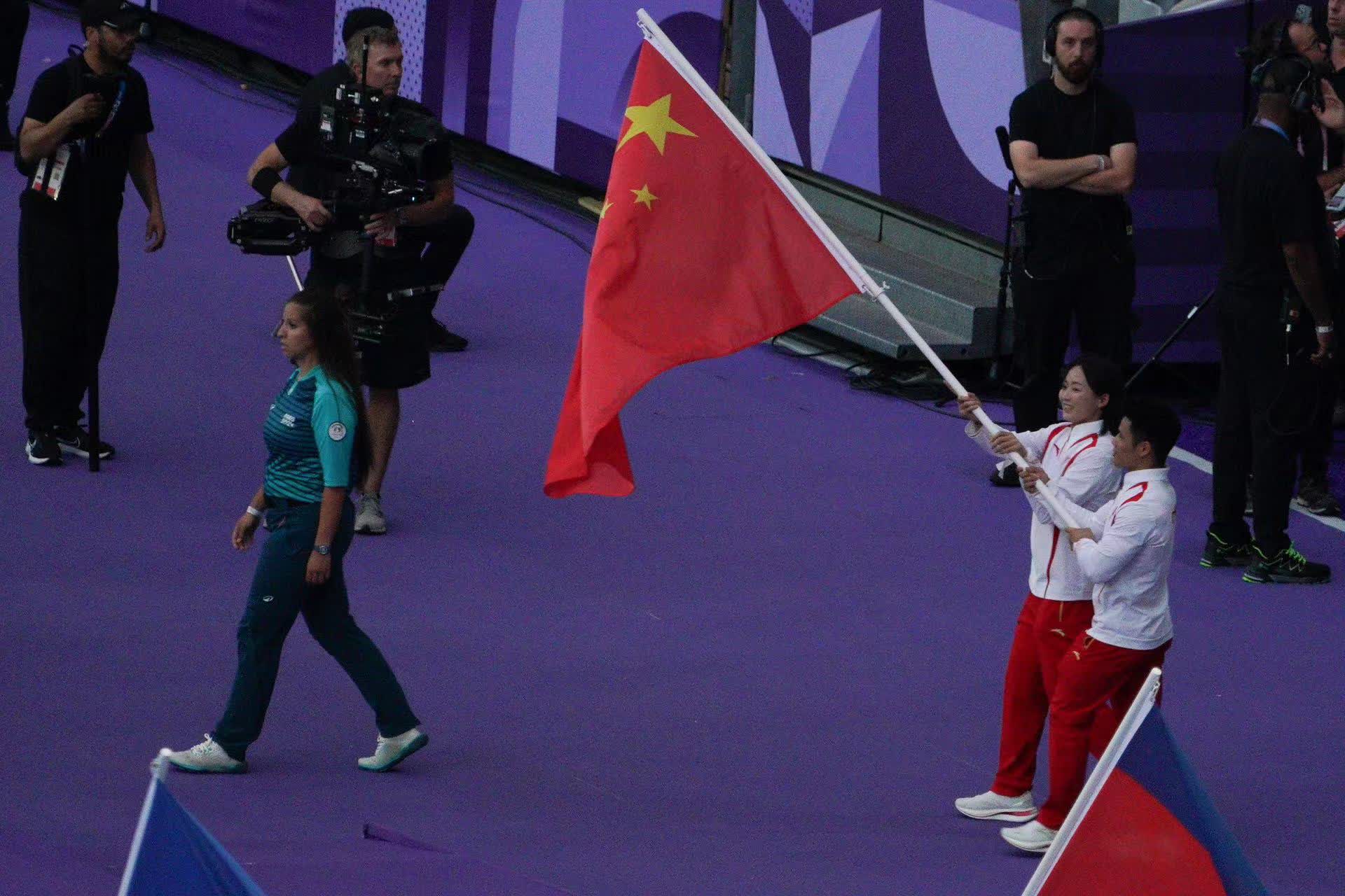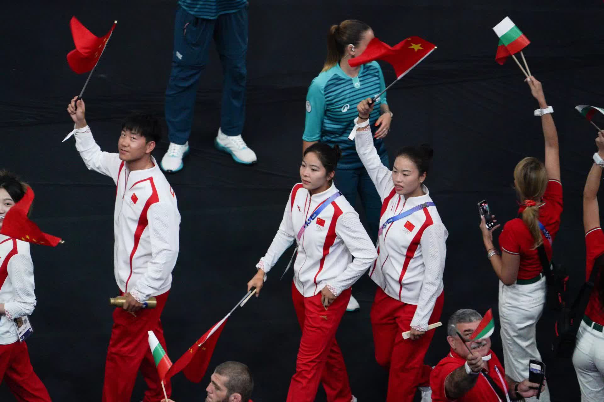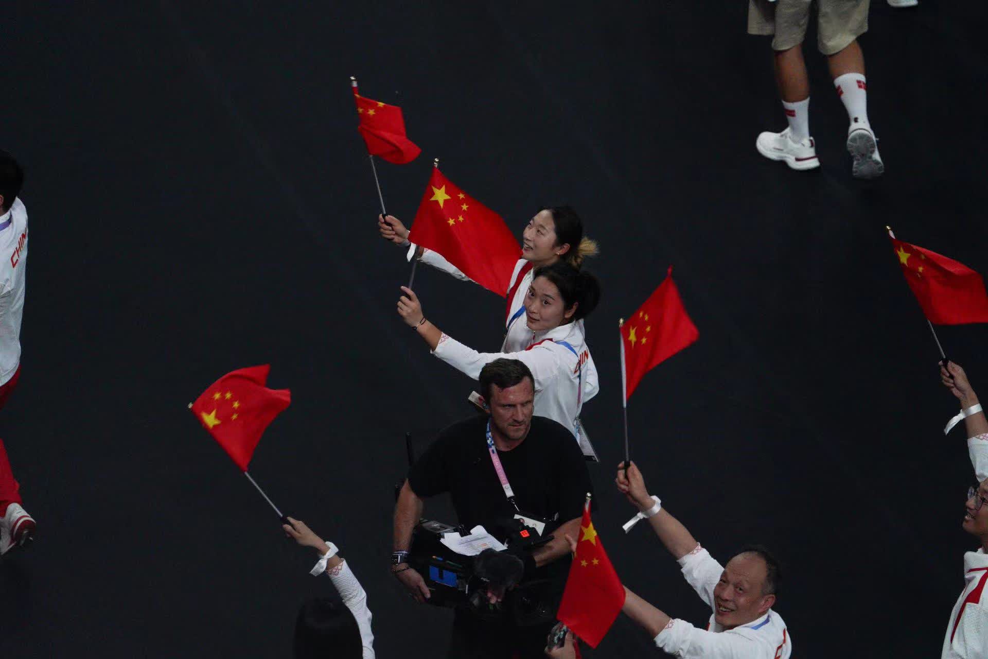 中國國家隊舉重奧運冠軍李發彬和女子曲棍球隊隊長歐紫霞手持五星紅旗入場。