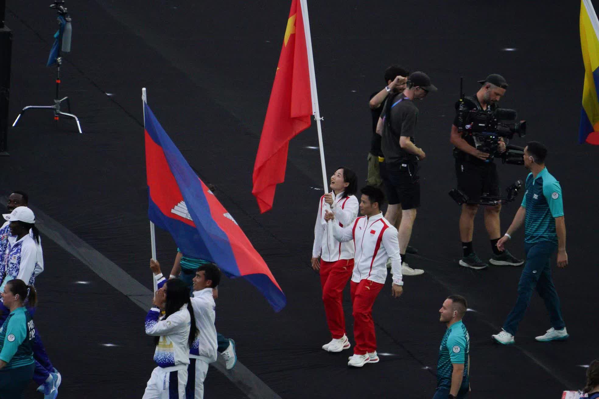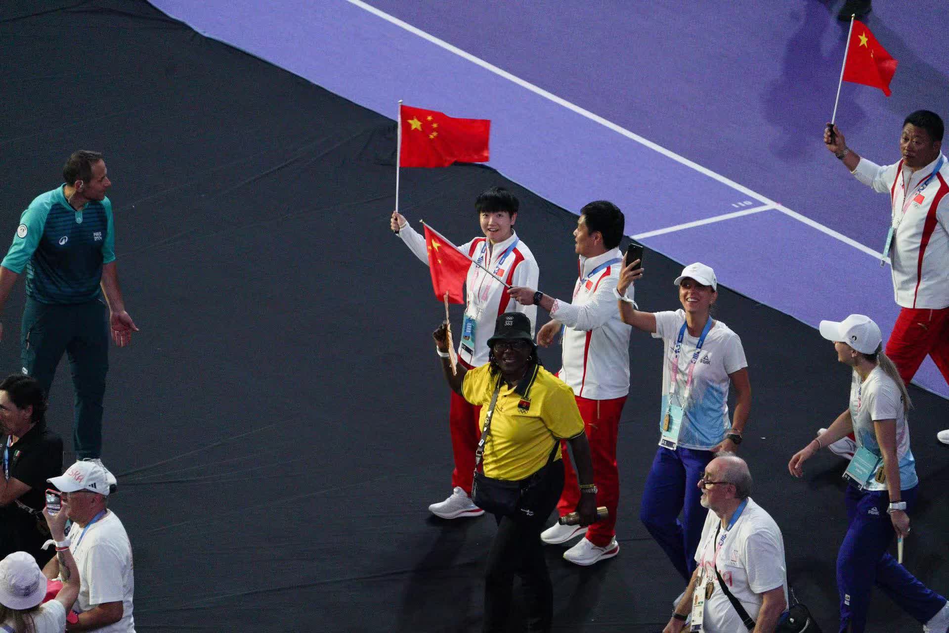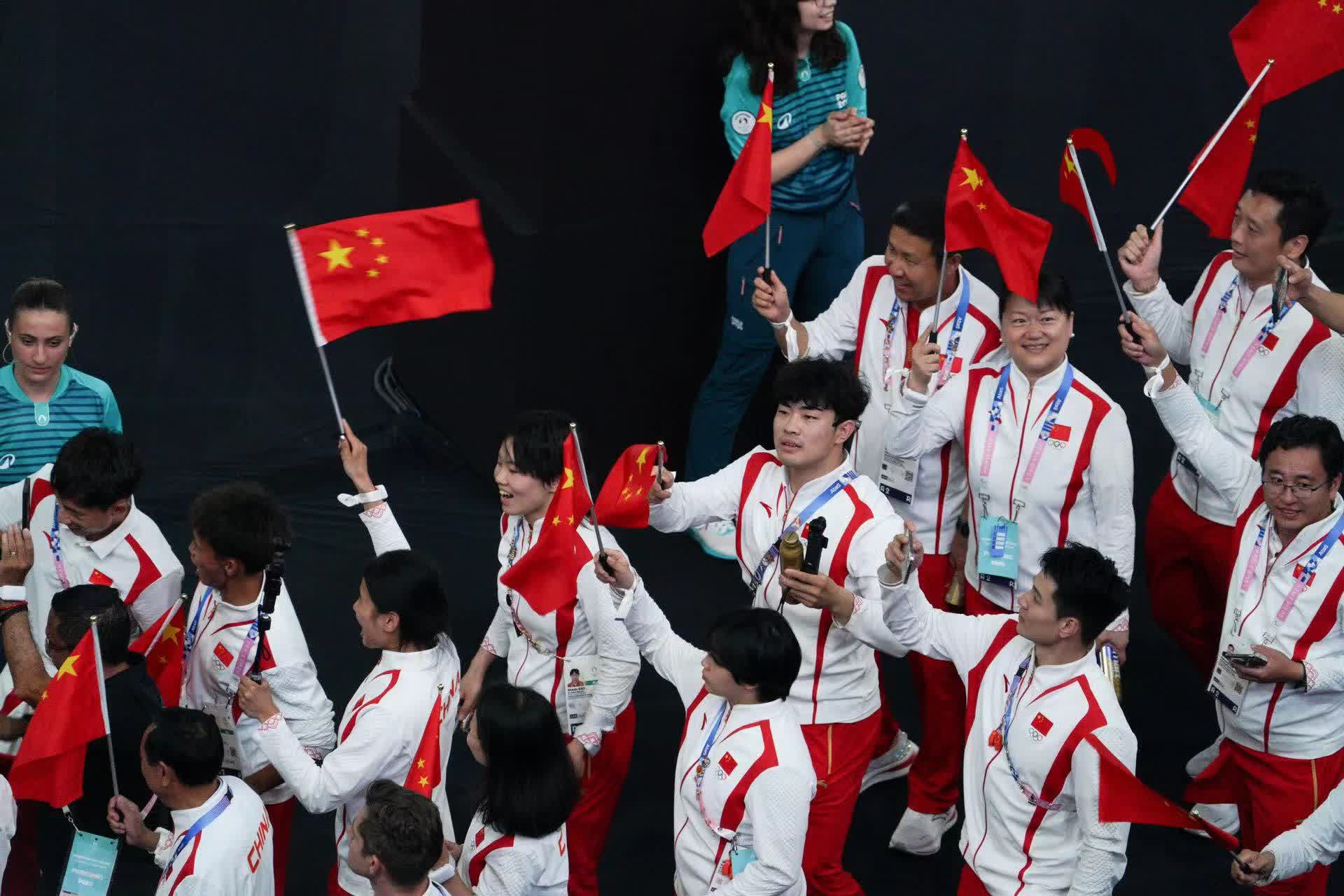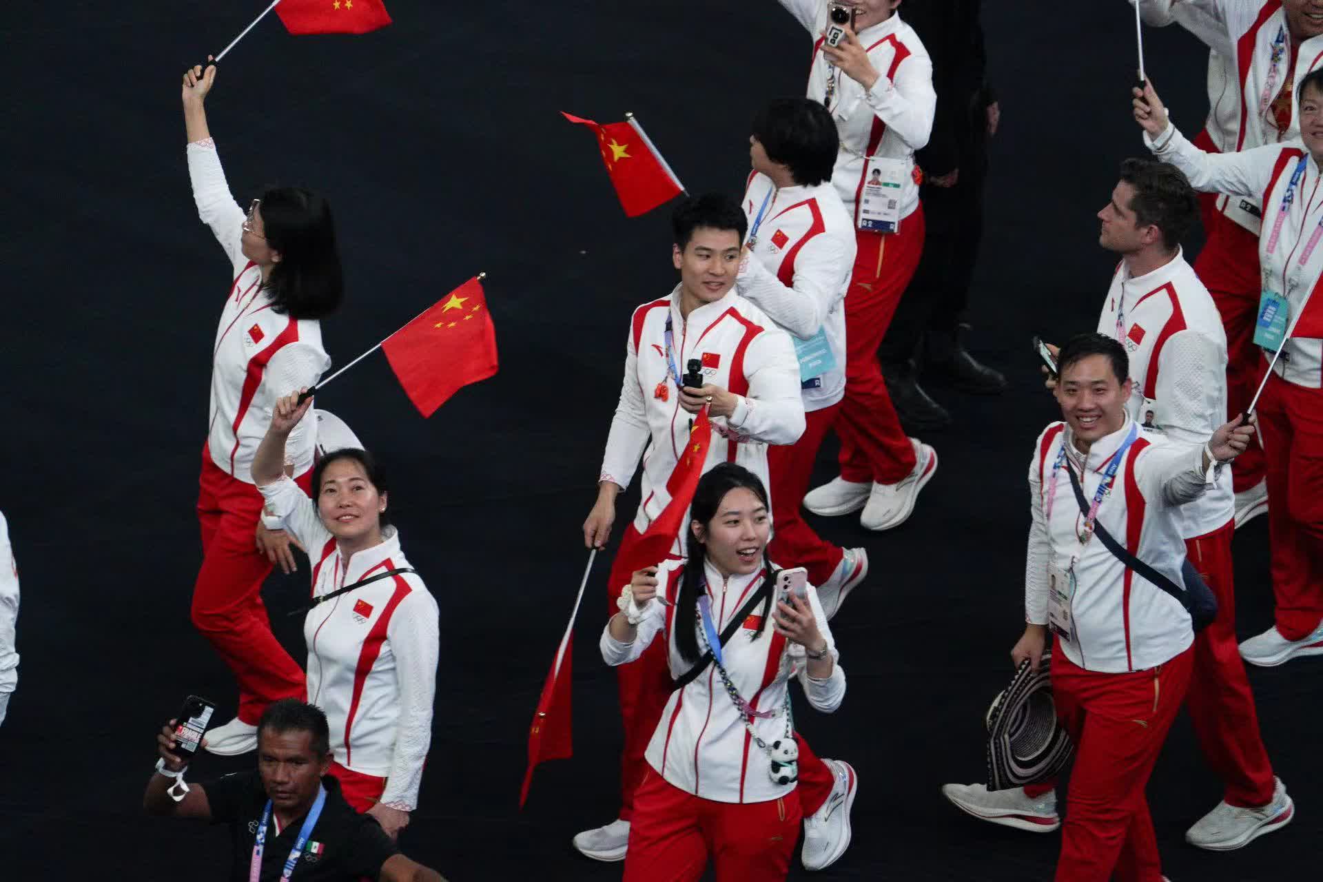 中國國家隊舉重奧運冠軍李發彬和女子曲棍球隊隊長歐紫霞手持五星紅旗入場。