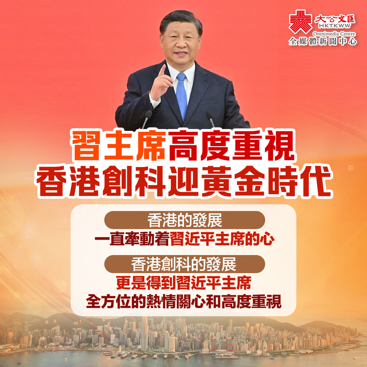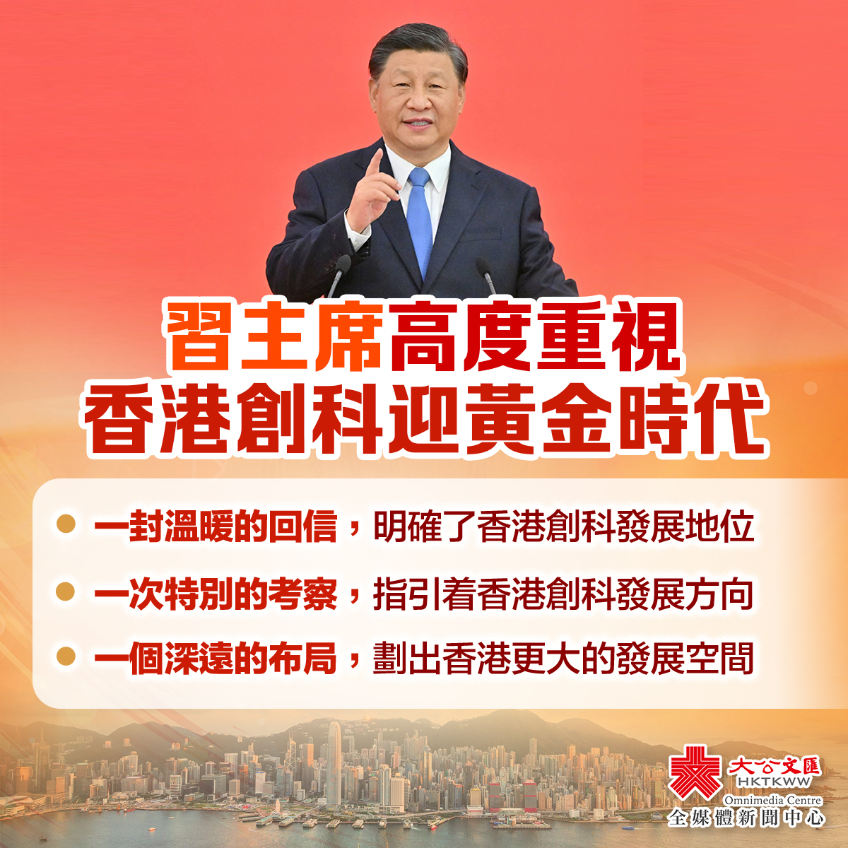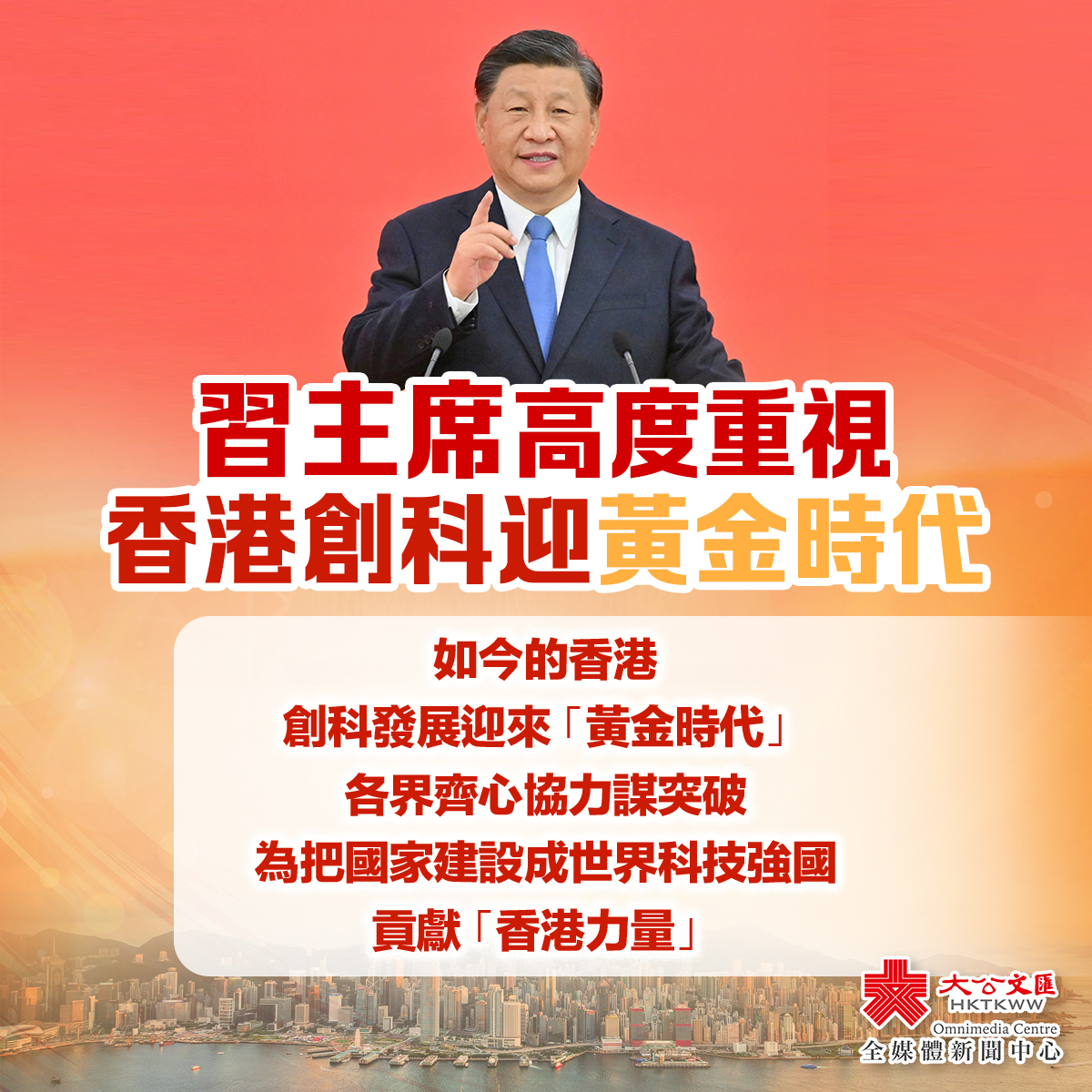 習近平在與科技界代表交流時又說,國家已將支持香港建設國際創科中心納入「十四五」規劃,對香港有很高的期望。希望香港發揮自身優勢,匯聚全球創新資源,與粵港澳大灣區內地城市珠聯璧合,強化產學研創新協同,着力建設全球科技創新高地。他表示,香港科技工作者是我國實施創新驅動發展戰略、建設創新型國家的一支重要力量。希望大家繼續弘揚愛國愛港傳統,堅定創新自信,瞄準世界科技前沿,積極對接國家重大戰略需求,着力攻克關鍵核心技術,為把我國建設成為世界科技強國作出貢獻。