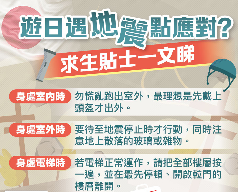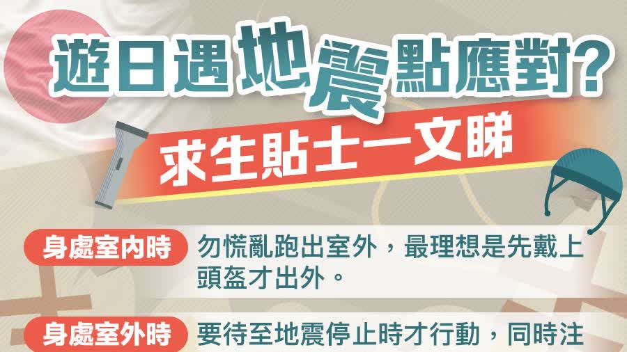 大公文匯全媒體報道,鑒於最近日本宮崎縣對開海域發生7.1級地震後,日本當局向日本部分地區發出巨大地震預警,特區政府亦提醒身在日本或計劃前赴日本的港人要提高警惕。由於本港絕少有地震發生,所以港人對地震的知識亦相對貧乏。有見及此,本文特此整理在遊日時若遇到地震,如何求生的貼士。