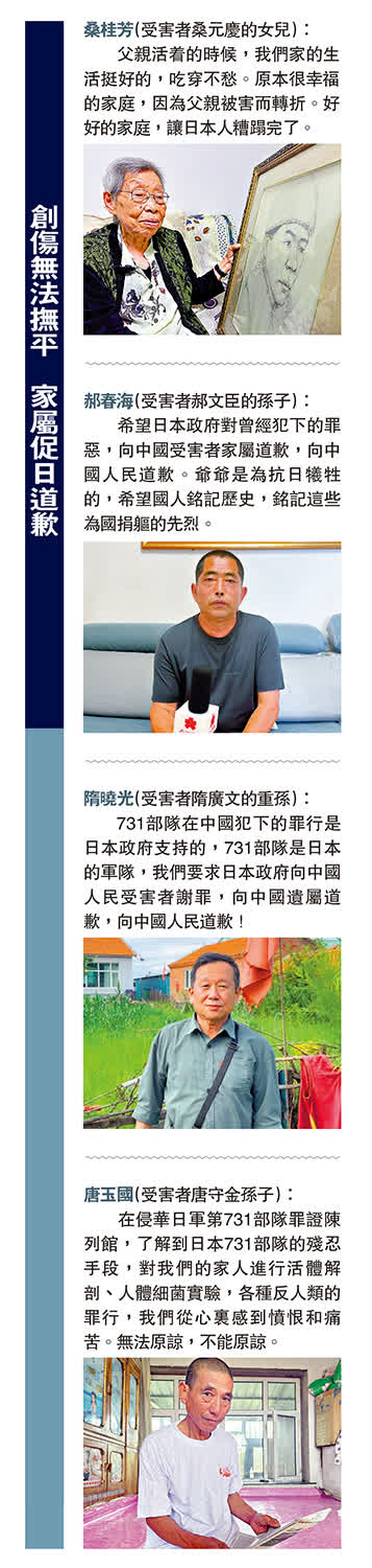 侵華日軍第731部隊給中國無數家庭帶來災難,讓受害者家屬飽受親人慘遭非人折磨的心靈傷痛。「我們沒有辦法代替先輩同胞去原諒他們,因為親人們曾遭受的非人折磨和痛苦是我們無從想像的!」「我希望日本政府能夠向我們遇害者家屬、向中華民族的兒女道歉。」得知原侵華日軍731部隊成員清水英男來哈爾濱第731部隊舊址懺悔道歉,受害者家屬郝春海對大公報記者說。其祖父郝文臣因從事抗日地下情報工作而被731部隊用作活體實驗殘忍殺害。