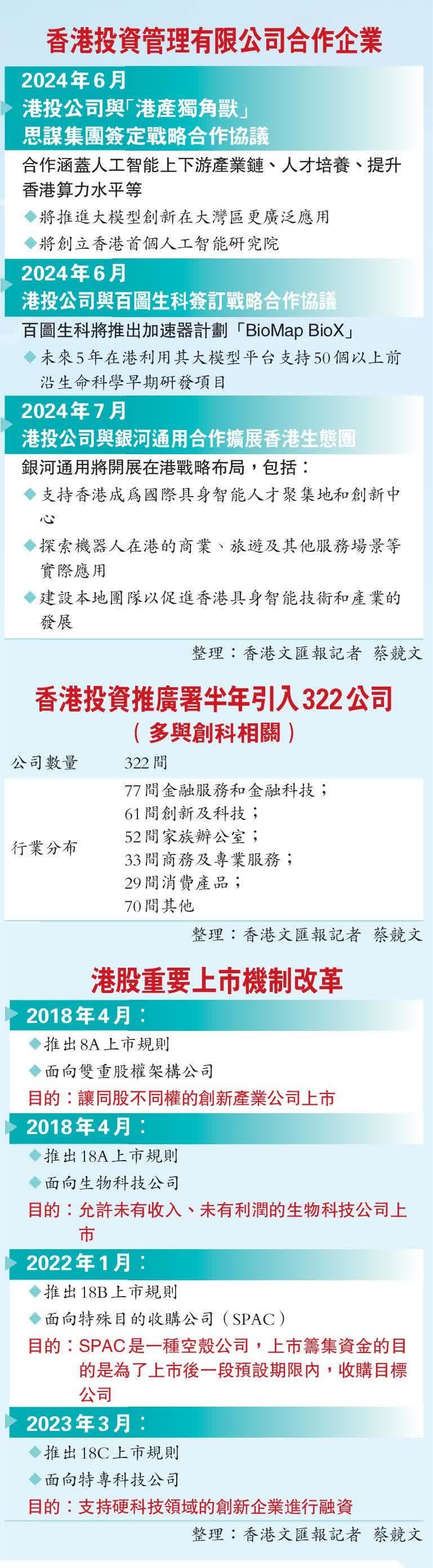 回顧全球創科發展,其中一個重要經驗,就是政府不但要做創科環境的營造者,更要親自「落場」,吸引、培育眾多創科企業。目前,除了香港科學園和數碼港作為本港兩大創科旗艦及創業培育基地之外,還有引進辦引進重點企業、投資推廣署主動幫助高增值科企落戶,特別是香港投資管理有限公司(港投公司)發揮資本引導作用、槓桿市場資源,綜合施策、多方着力,香港對科企的虹吸效應急劇提升。