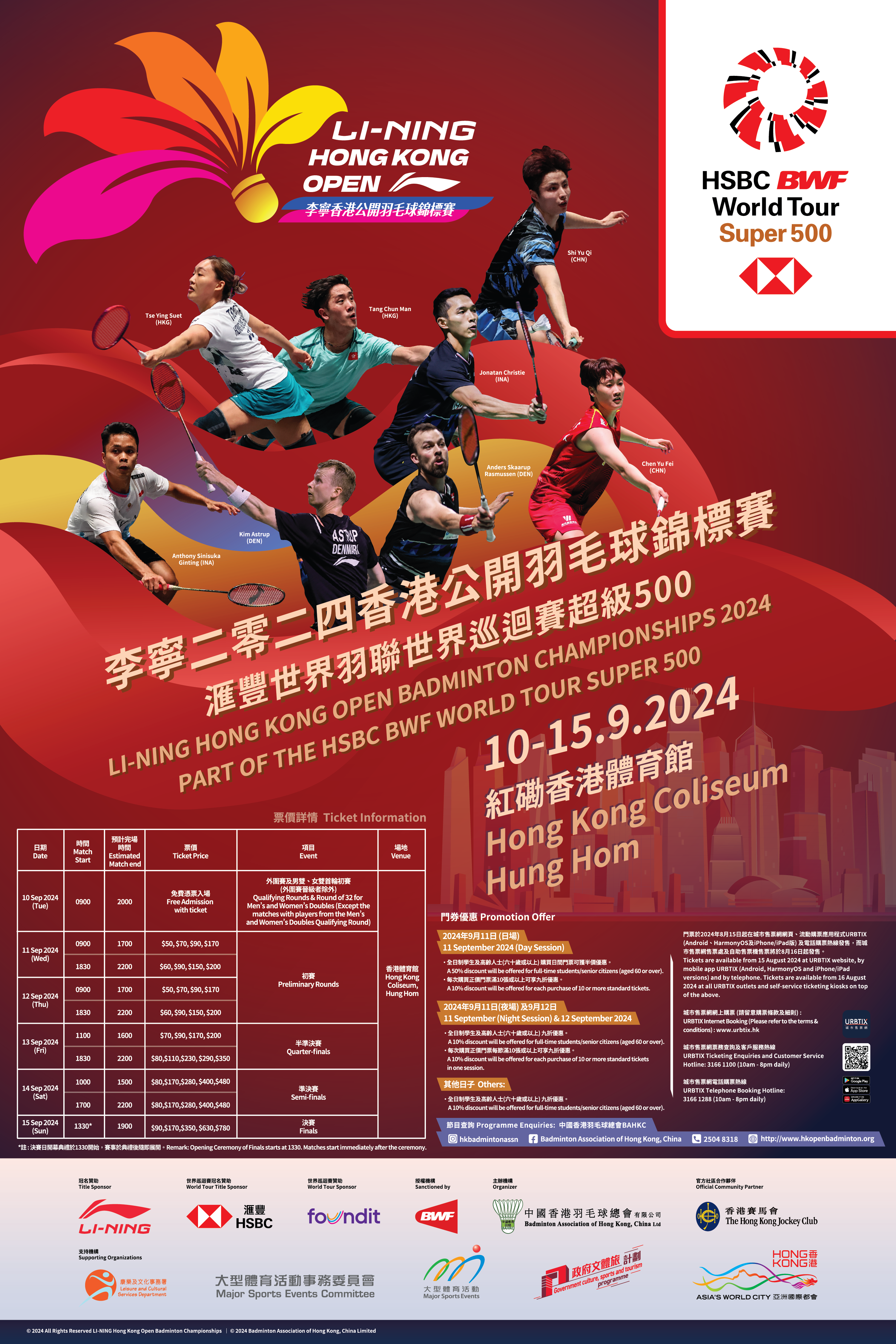 大公文匯全媒體報道,港隊運動員在2024巴黎奧運斬獲2金2銅,獲得了國際體育界的認可。羽毛球運動員們在奧運賽場上揮灑汗水、努力拚搏的精神也讓觀賽的市民們熱血沸騰。因此,承接本屆巴黎奧運的運動熱情與競技體育精神,世界羽聯巡迴賽香港公開賽(李寧香港公開羽毛球錦標賽 滙豐世界羽聯世界巡迴賽超級500)將在9月10日至15日於紅磡香港體育館舉行,門票將於明日(15日)公開發售。其中首日舉行的男雙和女雙預選賽和32強賽門票將免費派發,先到先得,額滿即止。