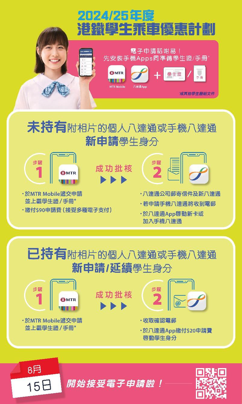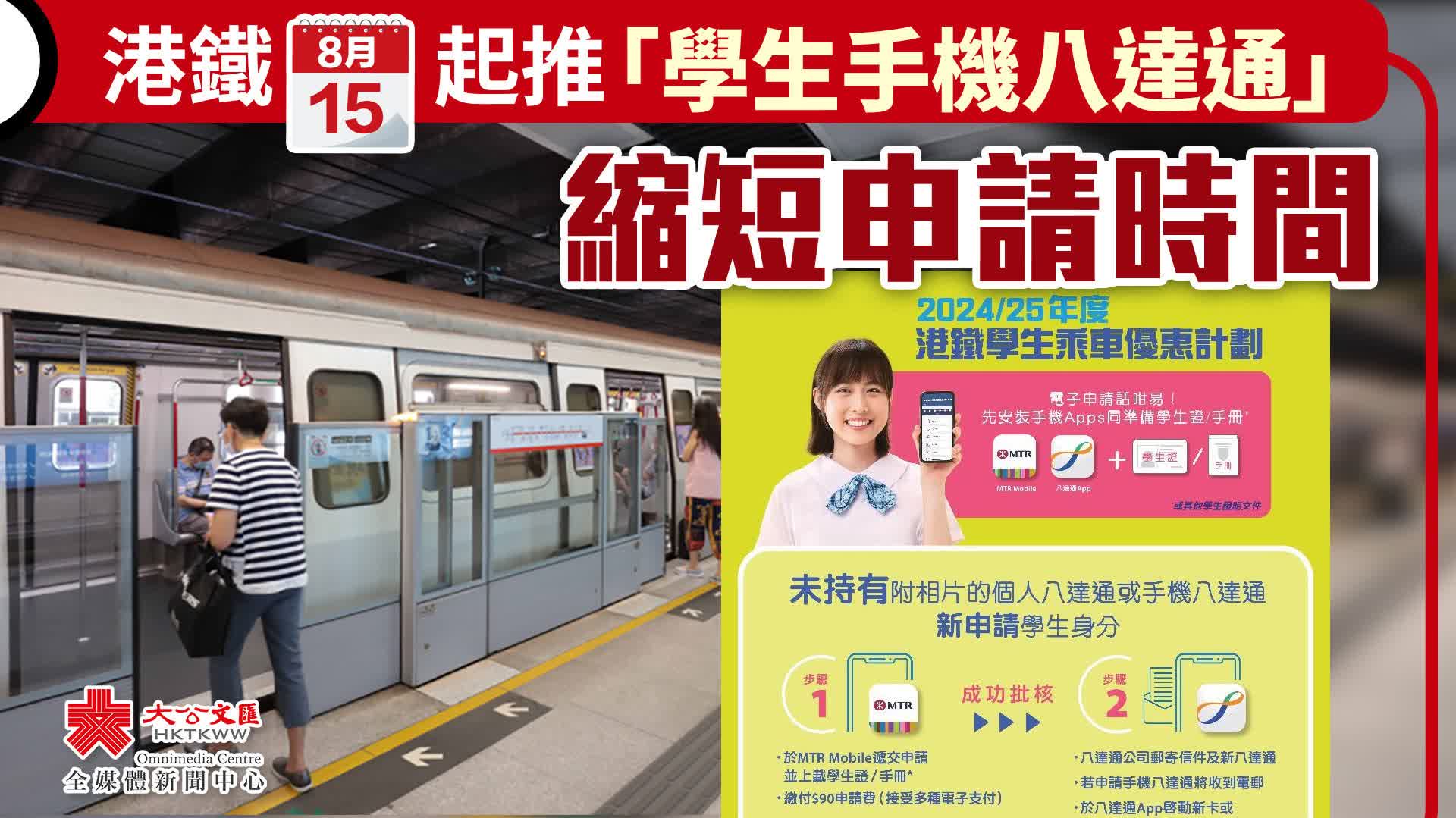 大公文匯全媒體報道,港鐵宣布,明日(15日)起接受新學年學生乘車優惠計劃的申請。除了計劃網站及MTR Mobile等電子平台外,港鐵今年更計劃推出「學生手機八達通」供同學選擇。申請成功後,學生可直接在個人手機加入「學生手機八達通」,毋須等候收取實體八達通。