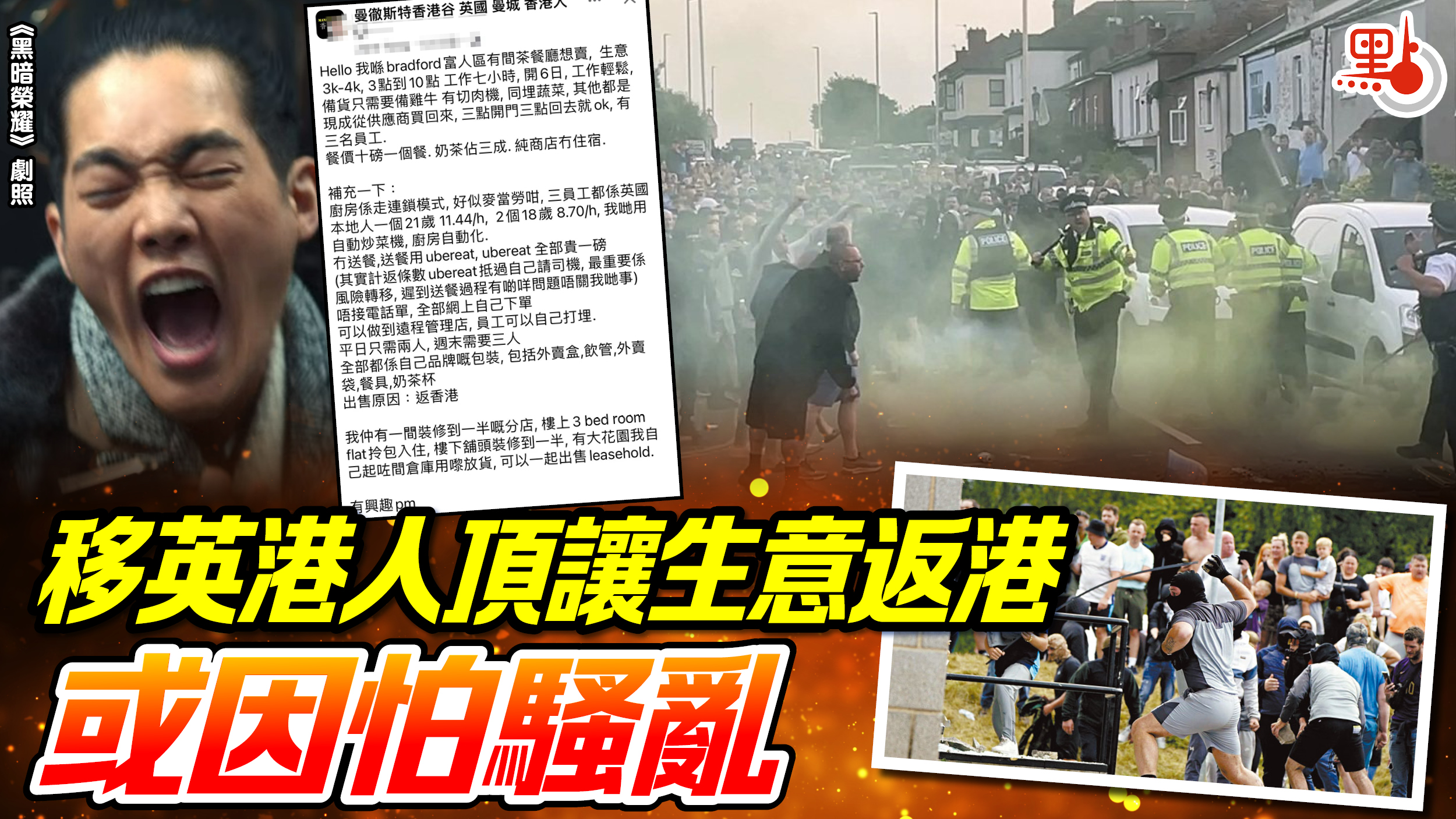 大公文匯全媒體報道,近日英國爆發反移民騷亂,英國是近年港人移民熱點,不少移英港人難免擔心會被反移民怒火波及。有在曼城開茶餐廳的移英港人就決定回流,在社交平台發文將店舖頂讓,並表明出售原因是「返香港」。