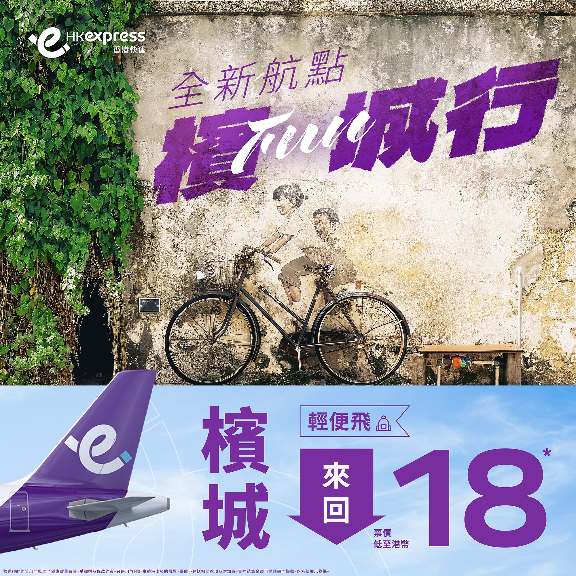 為慶祝檳城新航線的開通,快運特意推出限時優惠,檳城「輕便飛」來回機票票價低至港幣18元並包括一件隨身物品。市民即日起至8月18日晚上11時59分可以優惠價預訂,並須在11月21日至明年3月30日期間出發。