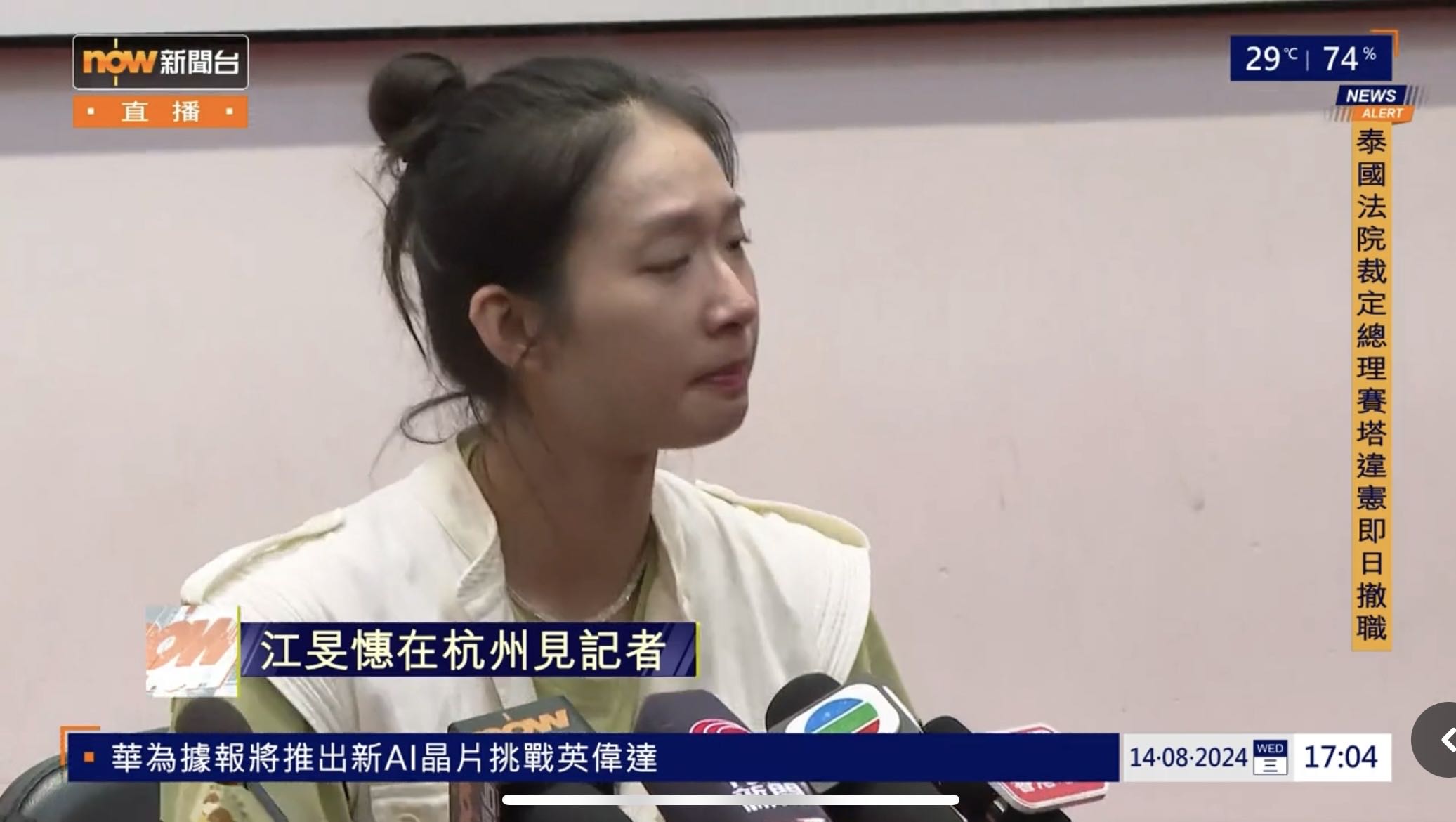 在被問及兩次到訪杭州的感受時,江旻憓表示這次與學習團有機會參觀這個城市,感覺很充實。她又回憶起第一次到訪杭州參加亞運會卻在賽場上惜敗的情景,表示感謝觀眾和志願者們的支持,儘管她在亞運會上失利,亦得到了全場鼓勵。她不禁落淚說,很希望當時鼓勵她的志願者看到了她在巴黎奧運會上奪冠。