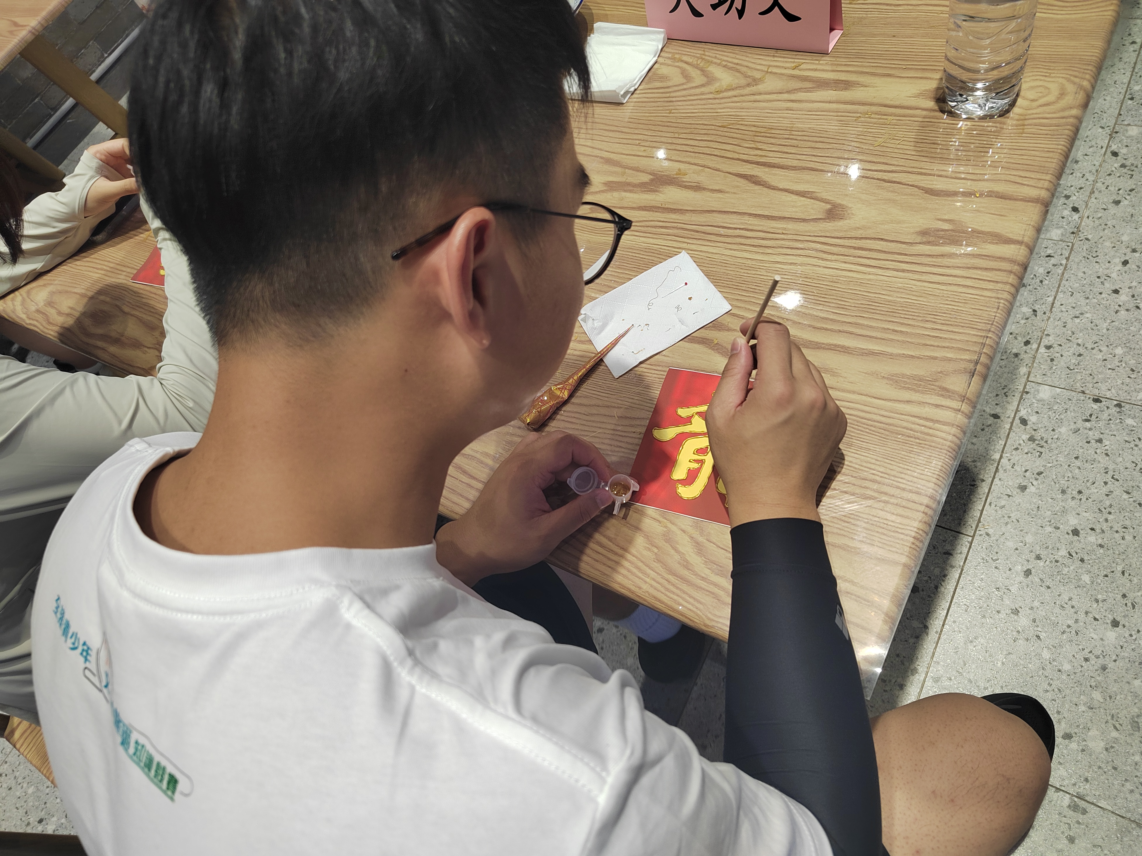 活動的第一場驚喜,就是非遺體驗瀝金彩繪。瀝金彩繪被戲稱為「中式裸眼3D繪畫技術」,古代多用於寺觀宮殿的樑柱彩繪和大殿壁畫中。山西元代的永樂宮《朝元圖》和北京明代的法海寺壁畫中,都完美的使用了這一繪畫技術。瀝粉工藝的特殊之處在於它高出物體,並在它的上面貼金、銀箔、上色等。具有厚度高、硬度強及華貴的感覺,增加了圖案的立體感。由於其工藝複雜,成本較高,古代這種繪畫工藝一直只有皇宮、佛寺才能使用。如今被新一代傳人用在了新的載體上,鏡框畫、布藝繪畫等,內容從佛經、佛像到吉祥語、如意符等種類繁多。當天,19名師生親手製作瀝金彩繪,體驗這項傳承幾百年的古老技藝。