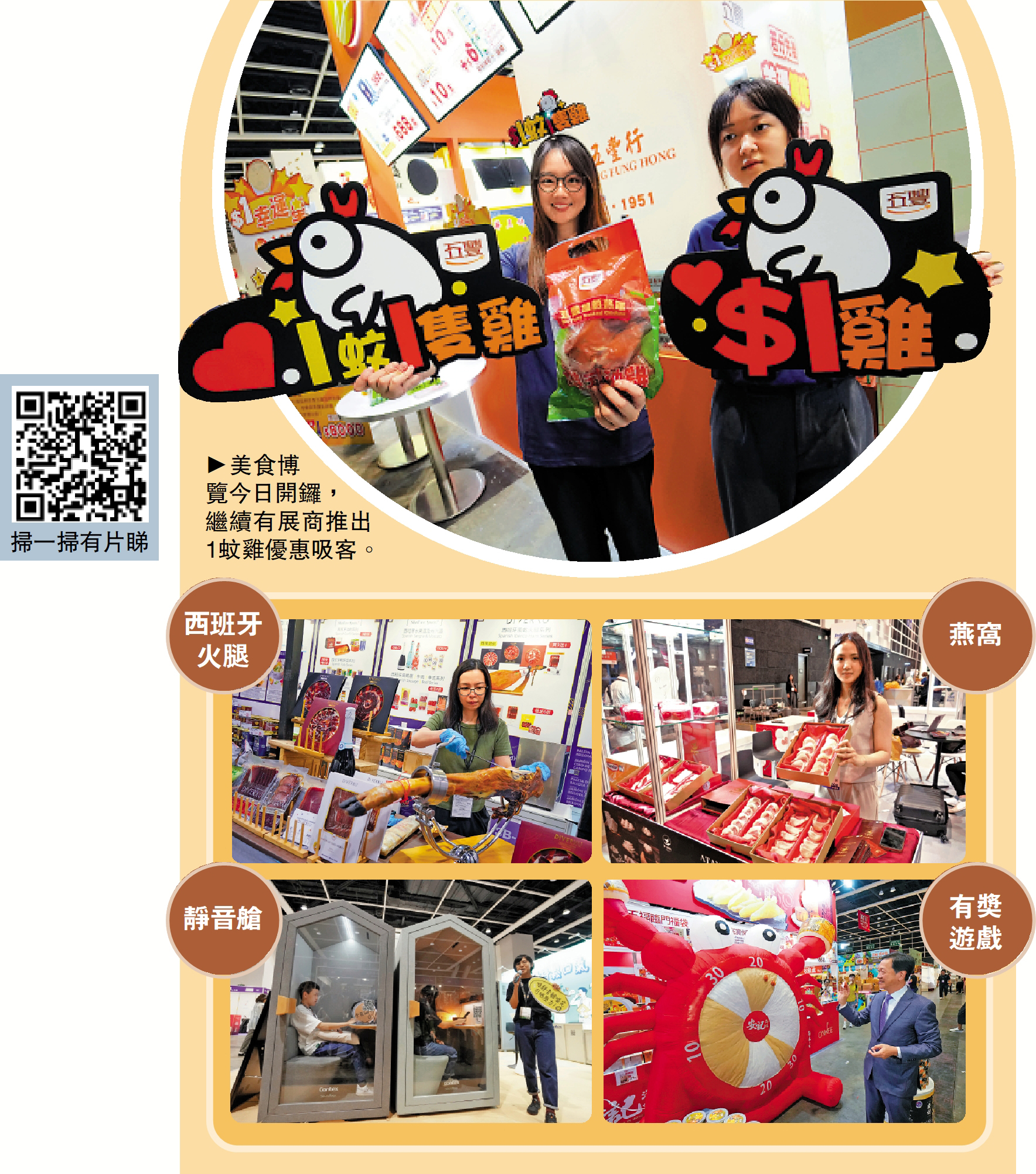 主打急凍雞煲類產品的「樂婷媽媽」推出限量「1毫子雞福袋」等優惠活動。該公司負責人梁女士表示,透過門市銷情見到市民的消費能力及喜好有變化,因此將以往均價200元至300元左右的商品,下調至100元以下,並因應上班族的需求,推出小分量的湯包產品。攤位將繼續出售港式小食熟食,並新推出蟹粉小籠包,以薄利多銷吸引入場人士光顧。