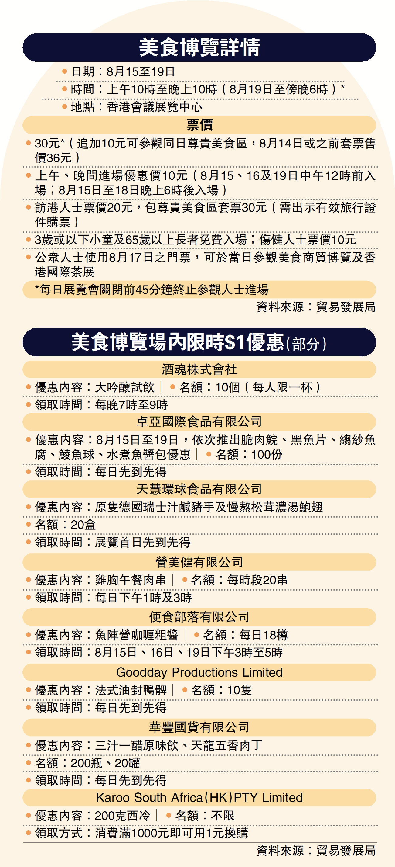 美食博覽、美與健生活博覽、家電·家居·博覽將同期舉行,美食商貿博覽及香港國際茶展兩項展覽,則會由今日起一連三日同場舉行,首兩日向貿易買家開放,最後一日則同時開放予公眾及貿易買家。