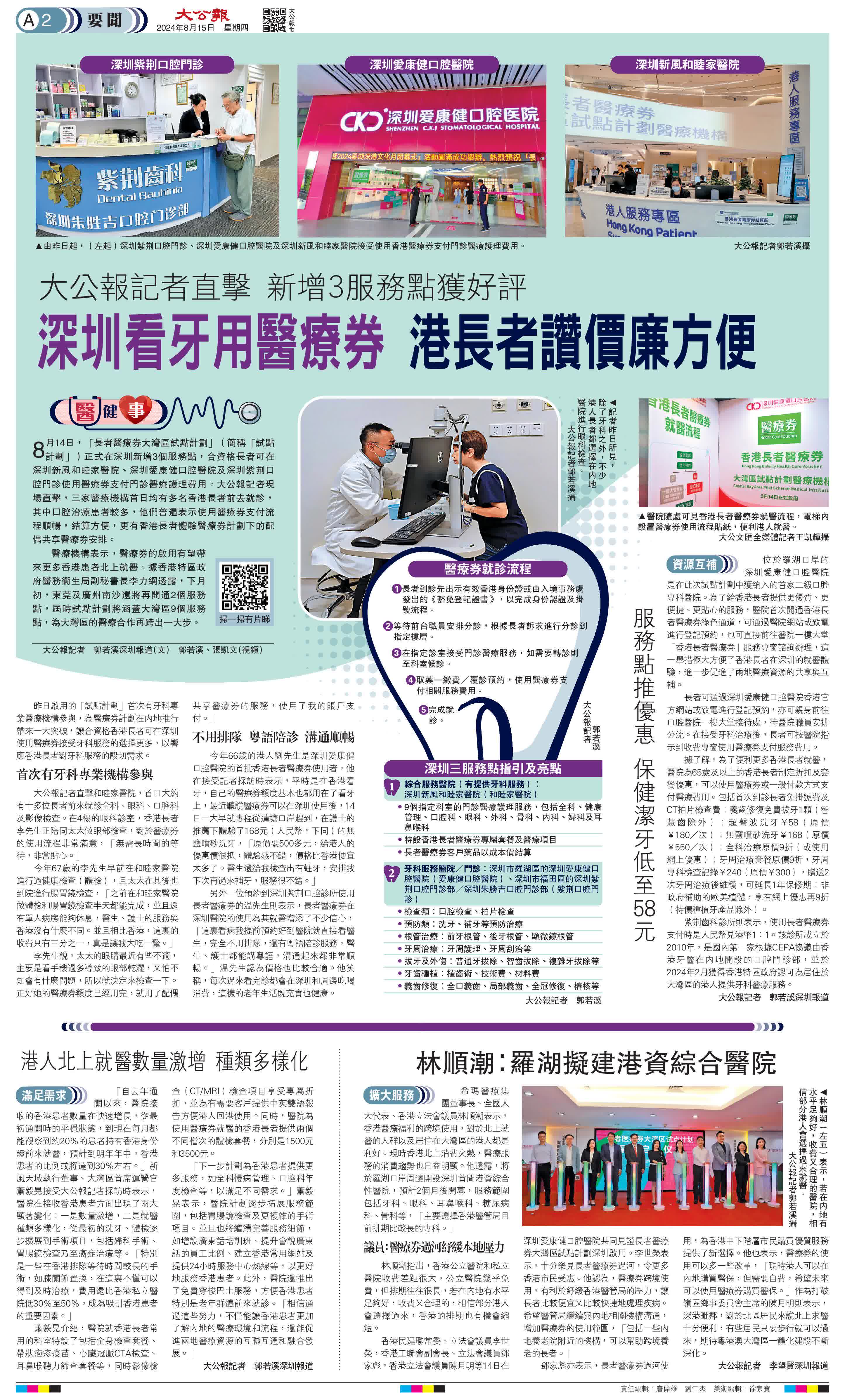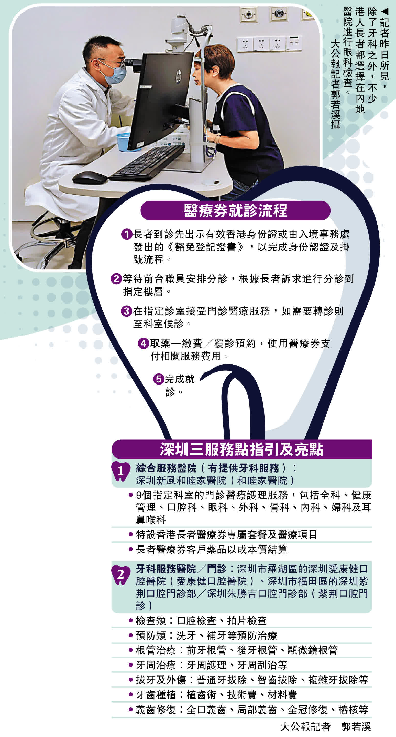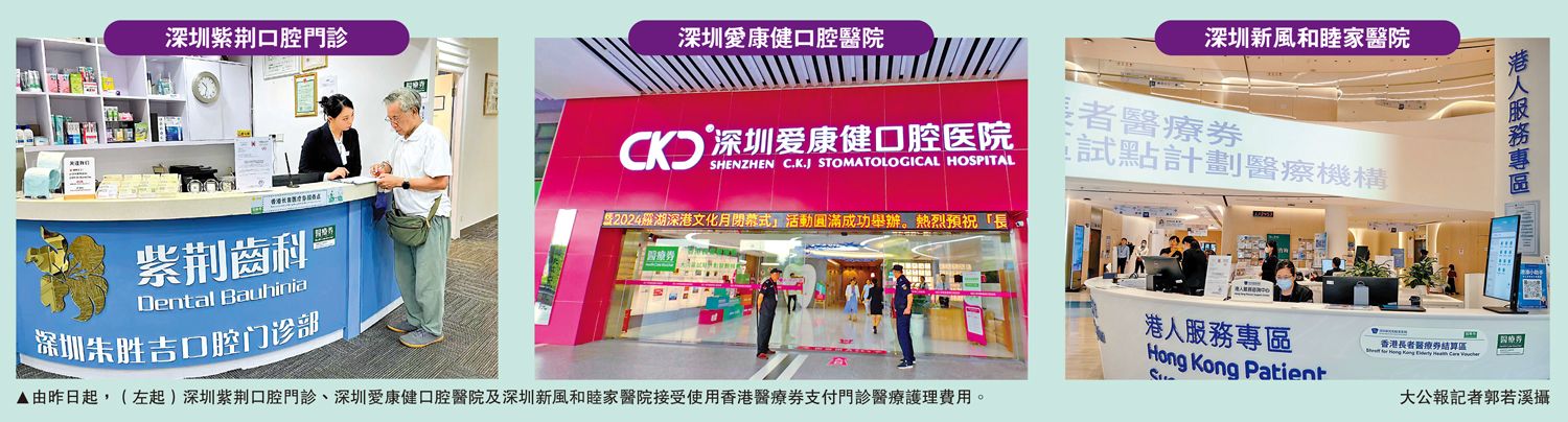 (大公報記者 郭若溪 深圳報道<文> 郭若溪﹑張凱文<視頻>)8月14日,「長者醫療券大灣區試點計劃」(簡稱「試點計劃」)正式在深圳新增3個服務點,合資格長者可在深圳新風和睦家醫院、深圳愛康健口腔醫院及深圳紫荊口腔門診使用醫療券支付門診醫療護理費用。大公報記者現場直擊,三家醫療機構首日均有多名香港長者前去就診,其中口腔治療患者較多,他們普遍表示使用醫療券支付流程順暢,結算方便,更有香港長者體驗醫療券計劃下的配偶共享醫療券安排。