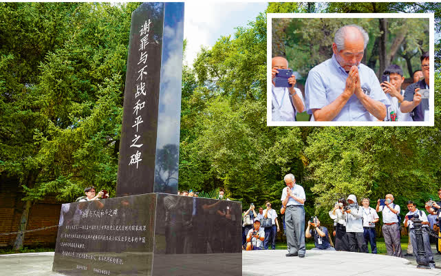 在「謝罪與不戰和平之碑」和陳列館內的殉難者名單前,清水英男雙手合十,深深鞠躬,表示懺悔和謝罪。