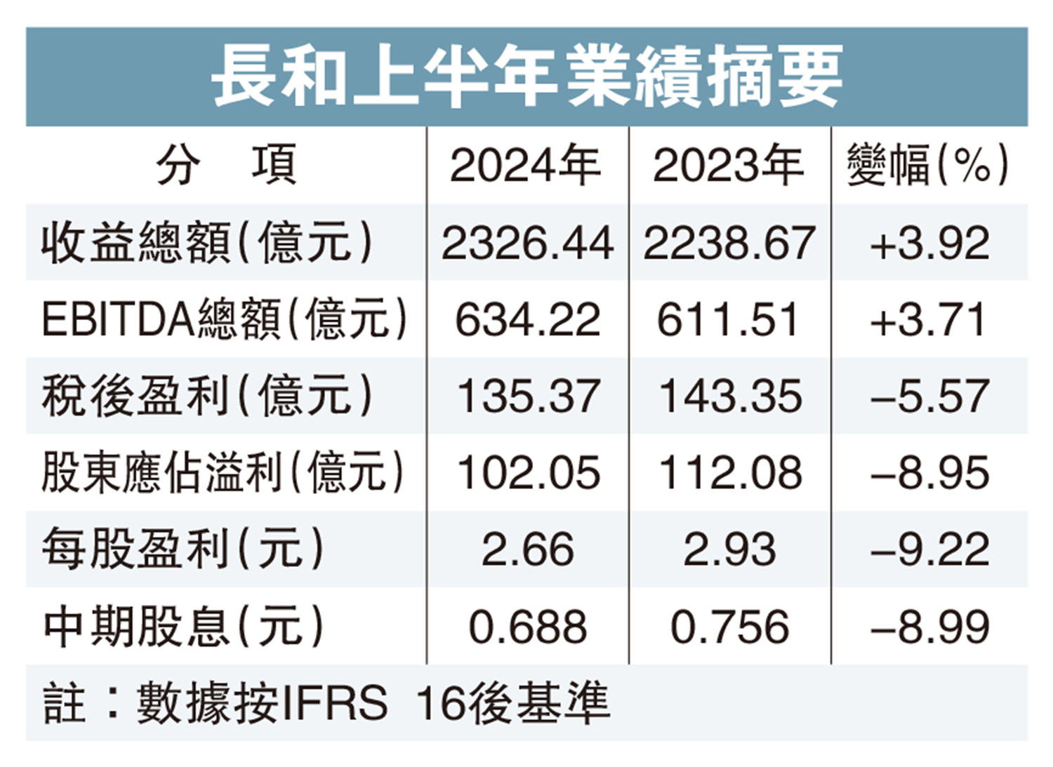長和(00001)昨日公布截至6月底止上半年業績(按IFRS 16後基準),總收入2326.44億元,按年增加3.9%;股東應佔溢利102.05億元,倒退8.9%;每股盈利2.66元,建議派發中期股息0.688元,減少8.9%。