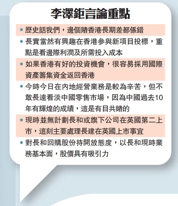 被問到長和或旗下公司會否尋求在倫敦證券交易所第二上市,李澤鉅坦言:「無,現時諗都未諗過,剛剛才宣布長建在(下周一)英國上市,搞掂長江基建先講。」至於就回購股份的可能性,李澤鉅表示,公司管理層對回購股份持開放態度,強調長和現時業務基本面良好,現時股價具有吸引力。