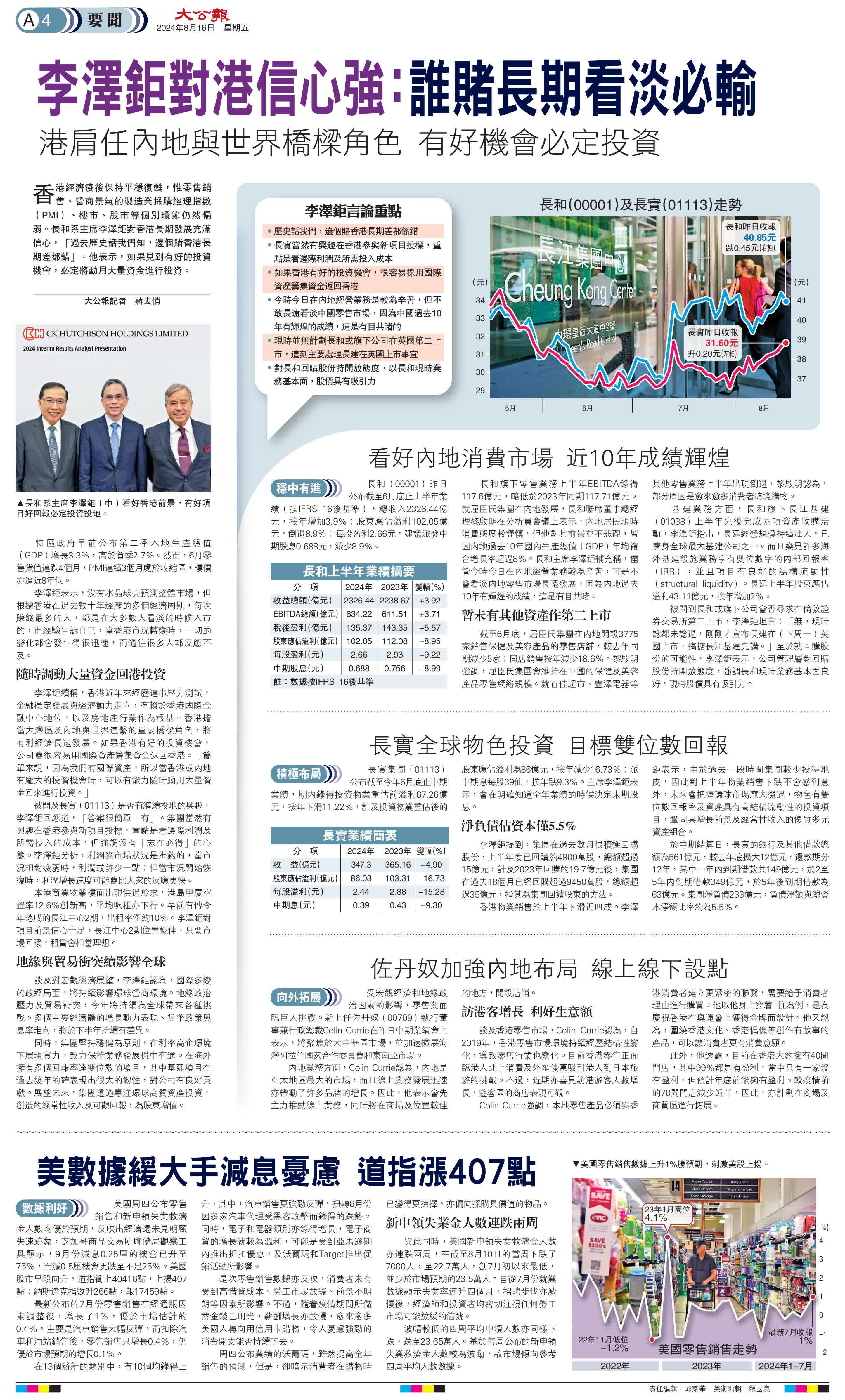 長和旗下零售業務上半年EBITDA錄得117.6億元,略低於2023年同期117.71億元。就屈臣氏集團在內地發展,長和聯席董事總經理黎啟明在分析員會議上表示,內地居民現時消費態度較謹慎,但他對其前景並不悲觀,皆因內地過去10年國內生產總值(GDP)年均複合增長率超過8%。長和主席李澤鉅補充稱,儘管今時今日在內地經營業務較為辛苦,可是不會看淡內地零售市場長遠發展,因為內地過去10年有輝煌的成績,這是有目共睹。