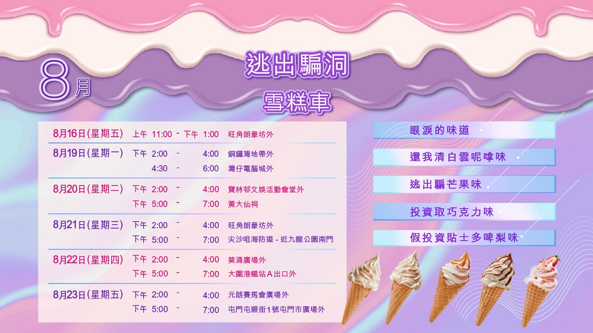 此外,今日(16日)至本月23日,協調中心推出「逃出騙局」主題雪糕車,伴隨防騙號宣傳車全港遊走。市民只需要完成簡單任務,就可免費換領期間限定「騙的味道」雪糕:「眼淚的味道」、「還我清白雲呢拿味」、「逃出騙芒果味」、「投資取巧克力味」及「假投資貼士多啤梨味」。即上協調中心網站或反詐騙協調中心小紅書、抖音賬號,睇雪糕車出現時間表。
