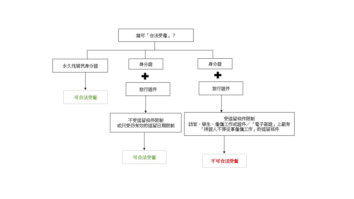 以此確定其是否可合法受僱。凡獲准以訪客、學生、僱傭工作等條件在港逗留的人士或旅行證件/「電子簽證」上載有「持證人不得從事僱傭工作」的逗留條件的人士,如未獲入境事務處處長批准,均不可合法受僱。