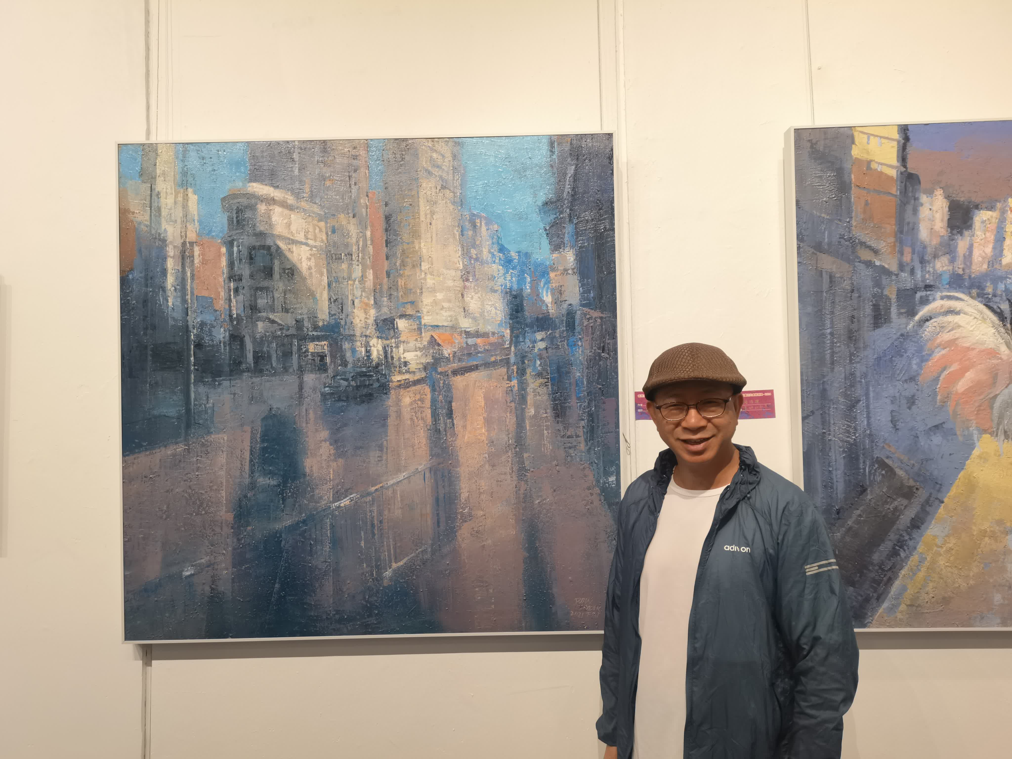 另一位作品選送入京的參展者潘躍輝比較擅長用油畫展示意象美,他今次展出作品《雷生春》和《展翅的鴕鳥》等作品,均以香港作為創作題材,前者展示光和影中的街道和行人,潘躍輝採用的是「過路人的視角」進行創作,畫面水霧蒙蒙,很有夢幻效果;後者則在疫情期間完成創作,空曠的街道有一隻鴕鳥跑了出來,作品頗具風趣,「疫情下家家戶戶都是足不出戶,但這個時候是否可以跑過一隻鴕鳥?我希望作品可以傳遞人們以正面之角度看待問題。」
